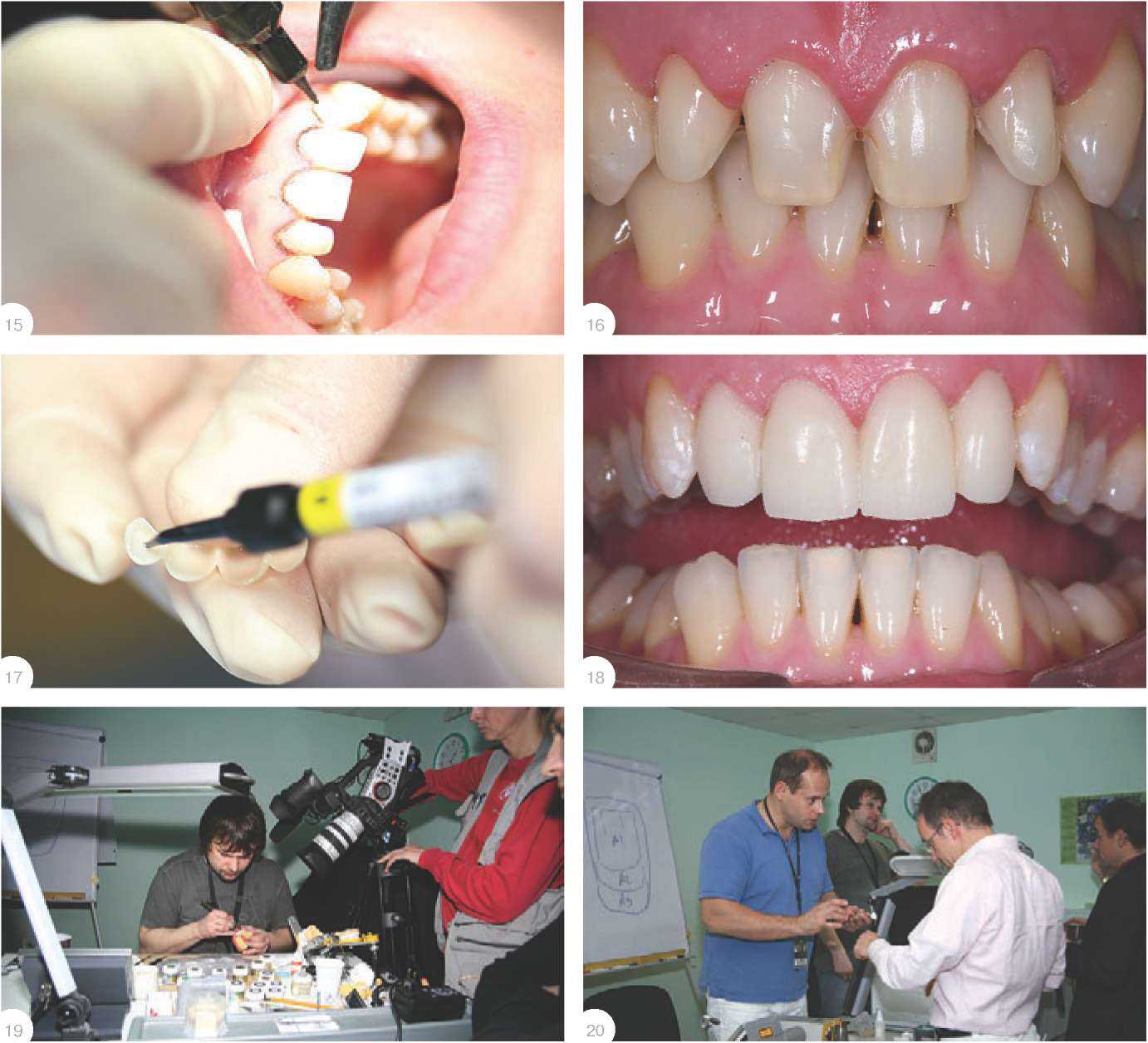 На мастер-классе был проведен небольшой эксперимент по оценке расширения гипса, замешанного различными способами. Опытный зубной техник один раз замешал гипс вручную, «на глаз», а второй раз - в вакууме, машинным образом, отмерив нужное количество порошка и жидкости. Разница составила 4% - достаточно большой процент для такой тонкой работы. Казалось бы, техник может сэкономить - как на качественном материале, так и на потраченном времени, но на самом деле он это время потеряет (а это, согласитесь, самое ценное, что есть у специалиста) на доработке некачественно выполненной работы. видуализировать реставрацию за счет создания текстуры поверхности. Она выполняется «псевдохаотичными» движениями - наносится сетка, которая состоит из вертикальных и горизонтальных борозд. Изначально наносится вертикальный рельеф, затем горизонтальный. Он соответствует перикиматиям - линиям роста зубов, и располагается не строго горизонтально, а несколько изгибаясь кверху - чем ближе к режущему краю, тем больше этот изгиб. Эти линии должны циркуляр-но охватывать всю коронку зуба, а не только со стороны лабильной пластины - за этим следует строго следить. Несколько слов о сколах. Несмотря на то, что изготавливаемая конструкция достаточно тонкая, О командной работе Главный успех работы - в командном подходе. Как складывается команда? Прежде всего, это должны быть единомышленники, люди, которые хотят чего-то достичь. Мы знаем много примеров знаменитых и успешных пар «врач-техник», которые стали таковыми за счет преимуществ работы в команде. Что необходимо для такой работы? В первую очередь, надо относиться очень критично к себе самому, не допускать ошибок, стараться выполнить работу максимально качественно, ведь каждая работа - это автопортрет ее создателя. Все клинические случаи требуют фотографировния и последующего анализа. Тогда придет понимание и появится возможность профессионального роста - через общение и взаимообогащение идеями и знаниями. сколы могут возникнуть лишь в том случае, если неправильно произведено пришлифовывание. Если не соблюдены нормы клыкового и резцового ведения или существует точка преждевременного контакта - тогда возможны сколы. Но этот вопрос должен решаться раньше - на стадии диагностики и планирования. Что касается самого фарфора, то за него можно быть спокойным. После того, как все этапы выполнены, начинается посадка конструкции на модель. Следует сразу сказать, что несмотря на все предпринятые меры, соблюдение технологии и следование плану, небольшие коррекции возможны. Эта часть работы не столько сложна, сколько требует особой терпеливости. Даже при правильном выполнении всех этапов и использовании материалов с контролируемыми физическими показателями существует риск появления поднутрений, что может послужить препятствием для идеальной посадки. После того как все коррективы были внесены, второй день семинара был закончен. Фиксация Третий день мастер-класса был посвящен фиксации в полости рта конструкций, изготовленных накануне. Поскольку все нюансы реставраций были учтены на предыдущих этапах, работа была сугубо технической, однако требовавшей не менее тщательного соблюдения технологии. Разумеется, обязательным элементом является изоляция рабочего поля с помощью коффердама - об этом говорится много,