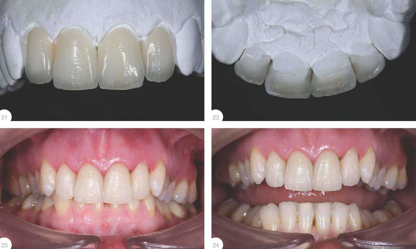 Планирование вмешательства проходило при активном участии пациентки. Вообще, мнение пациента играет немаловажную роль, хотя здесь кроется известное противоречие: специалисты ставят функцию на первое место, тогда как для пациента зачастую важнее эстетика, и одна из важнейших задач - устранить это противоречие так, чтобы все участники процесса остались довольны результатом. В результате за первый день, после диагностики, выполнено восковое планирование, на основании которого были изготовлены силиконовые ключи. С их помощью проведено препарирование и изготовлены временные виниры из пластмассы New Outline (AnaxDent, Германия) с которыми пациентка ушла домой. Пациенту необходимо какое-то время побыть со своими новыми зубами, ощутить себя в новом качестве - другими словами, нужно время на адаптацию. Именно на этом этапе мы можем при необходимости внести коррективы и необходимые изменения. У пациентки на это была только одна ночь, однако наутро она уже смогла высказать свои пожелания -вполне понятные и адекватные (видимо, сказался профессиональный опыт). С технической точки зрения проблем также не возникло - без труда выполнена коррекция, поскольку пластмассовые коронки легко позволяют укоротить или нарастить длину зуба, корректировать его форму и т.д.