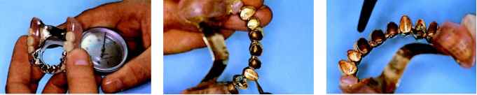 | С помощью микрометра контролируют, толщину вторичных телескопов. Изнутри коронки шлифуют, создавая место под пластмассу. Продувают сжатым воздухом от стружки металла. |