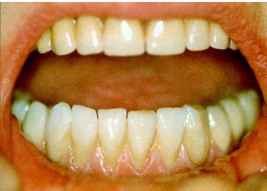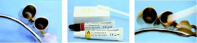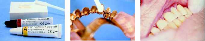 | Пластмассу ФГП замешивают. 1:1. И слоем без пор наносят внутрь. Пациента просят равномерно и медленно сомкнуть челюсти. |