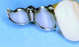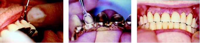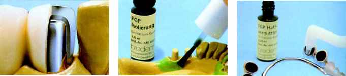 | В результате подготовки модели образовалась дистанция между коронками, которая и будет заполнена ФГП. Модель изолируют. ФГП гелем тонким слоем протравливают внутреннюю поверхность коронок. |