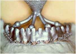 | Поверхность из золотосодержащего сплава увеличенная в 100 раз. Остаточная степень фиксации 2 Ньютона Или всего 25% Поверхность покрытая пластмассой ФГП увеличенная в 100 раз. Остаточная степень фиксации 6 Ньютона Или все еще 75% |