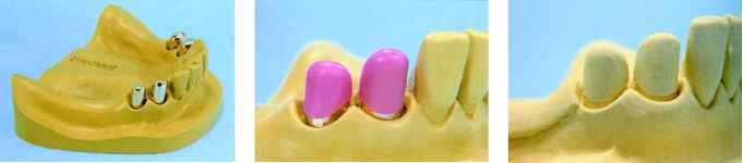 | Для дистанции места под ФГП возможно применять погружной воск. Толщина стенок 0,2 мм и 1 мм отступя от края коронок. Сдублированная модель с уступом в области шейки. |