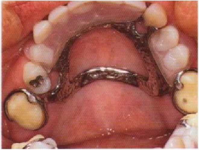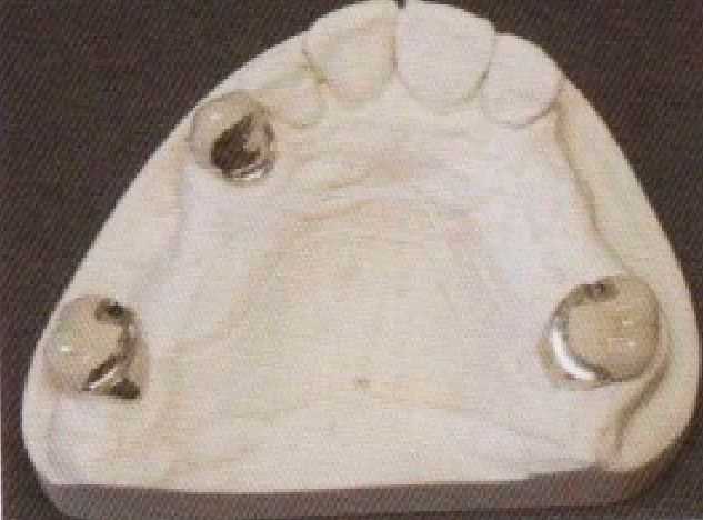 Рис. 10-13. Временные коронки, фиксированные на правом и левом первых молярах верхней челюсти, предназначенные для улучшения фиксации имеющегося частичного съемного протеза на время создания постоянных искусственных коронок и замены частичного съемного проте за.