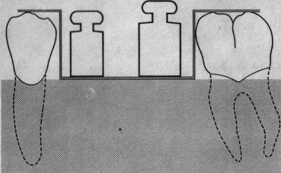 Так как место наибольшей нагрузки базиса во время жевания невозможно установить, нужно другим способом устранить атрофию костной ткани альвеолярного отростка у края базиса протеза. Таким способом является опора базиса на зуб. При включенном дефекте зубного ряда такую опору базиса нужно делать у двух концов базиса и такой базис по характеру опоры сходен с мостовидным протезом.