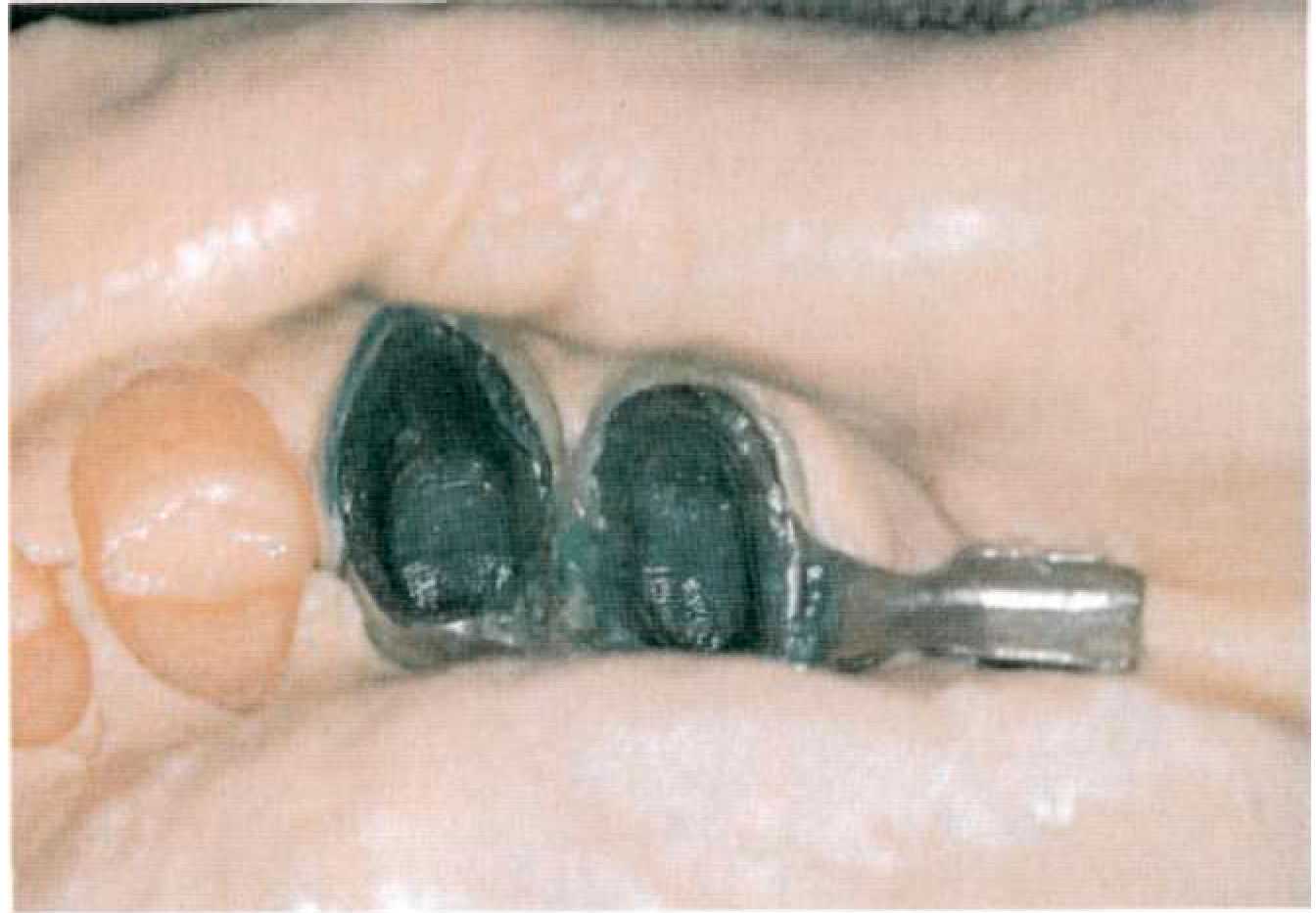 Этап 5. После нанесения зубным техником керамической облицовки в клинике проводят припасовку металлокерамических коронок опорных зубов (рис. 109). Выверяют окклюзионные контакты, цвет. Этап 6. После глазуровочного обжига коронки фиксируют в полости рта на корригирующий оттискной материал для избежания смещения (рис. 110) и снимают оттиск для изготовления съемной части комбинированного протеза. Возможно применение индивидуальной ложки, изготовленной по предварительному альгинатному оттиску. Опорные коронки с замковыми креплениями переходят в оттиск (рис. 111). Этап 7. В лаборатории опорные коронки заливают воском и по полученному оттиску изготавливают рабочую модель (рис. 112). К замковому креплению, установленному на опорных коронках, присоединяют комплементарную часть (рис.113) или ее аналог. В зависимости от типа замкового крепления и конструкции съемной части протеза модель дублируют или проводят моделировку каркаса на рабочей модели, используя беззольную пластмассу (рис. 114).