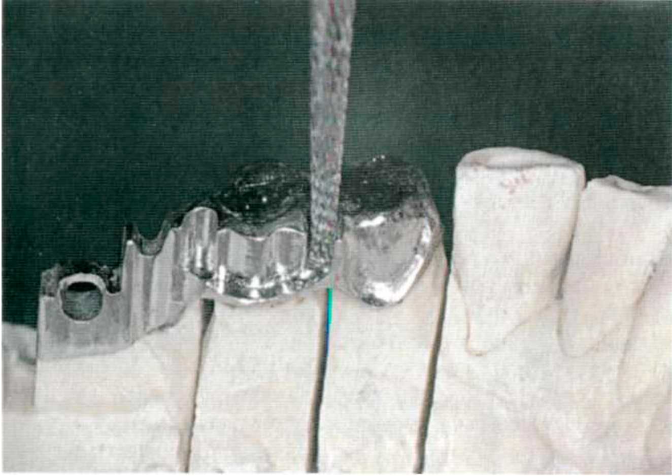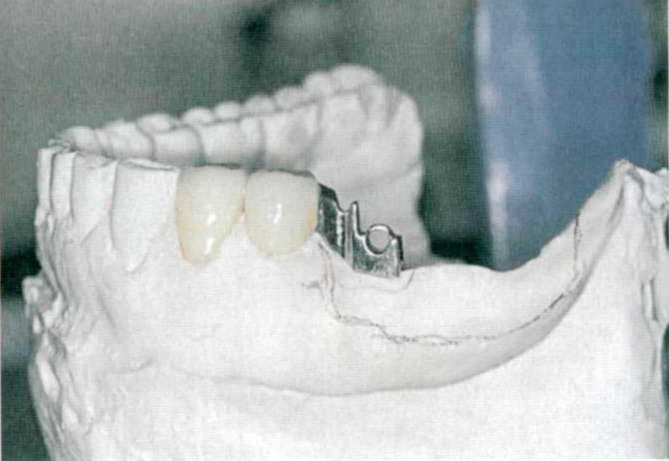 После литья изготовленный каркас припасовывают на модели (рис. 115). Затем проводят окончательную отделку каркаса, постановку зубов на воске, замену воска на пластмассу, окончательную отделку протеза. Для многих конструкций замковых креплений именно на этом этапе фиксируют вторую часть аттачмена в каркасе съемной части протеза.