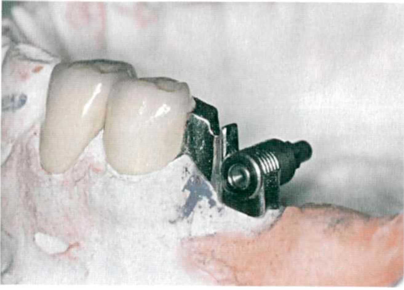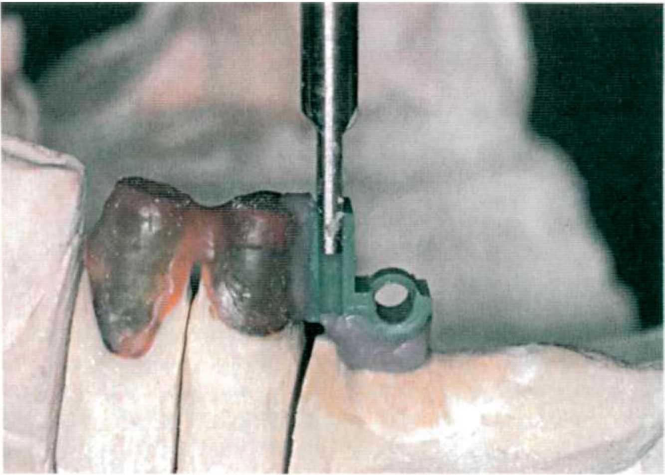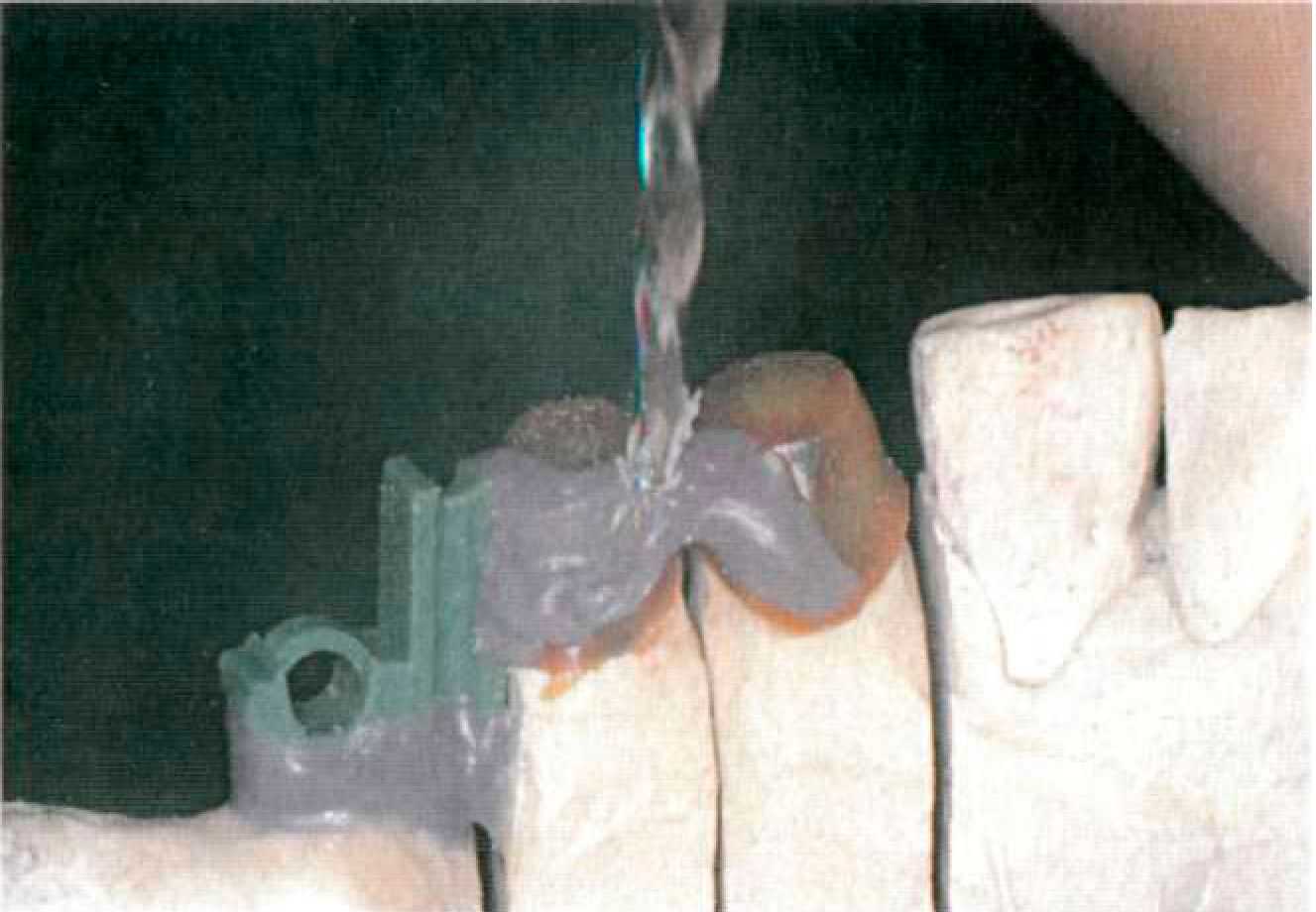 Далее снимают двухслойный или однослойный (монофазный) оттиск силиконовым оттискным материалом, препарированные зубы покрывают временными коронками (рис. 105). Определяют центральную окклюзию с формированием протетической плоскости. Этап 3. В лаборатории зубной техник изготавливает разборную модель из супергипса, гипсует модели в артикулятор и моделирует каркас коронок опорных зубов с патрицей или матрицей аттачмена, установленной в параллелометре (рис. 106). Обязательным условием при использовании жесткого замкового крепления является фрезерование опорных коронок (рис. 107).