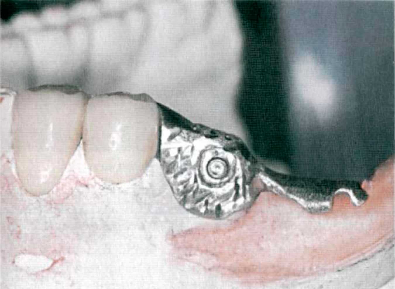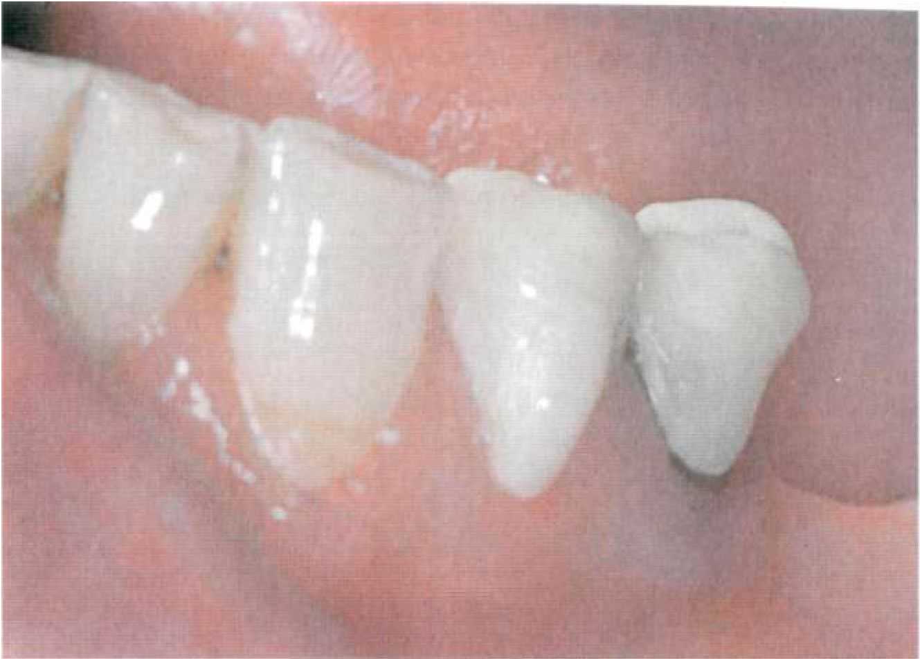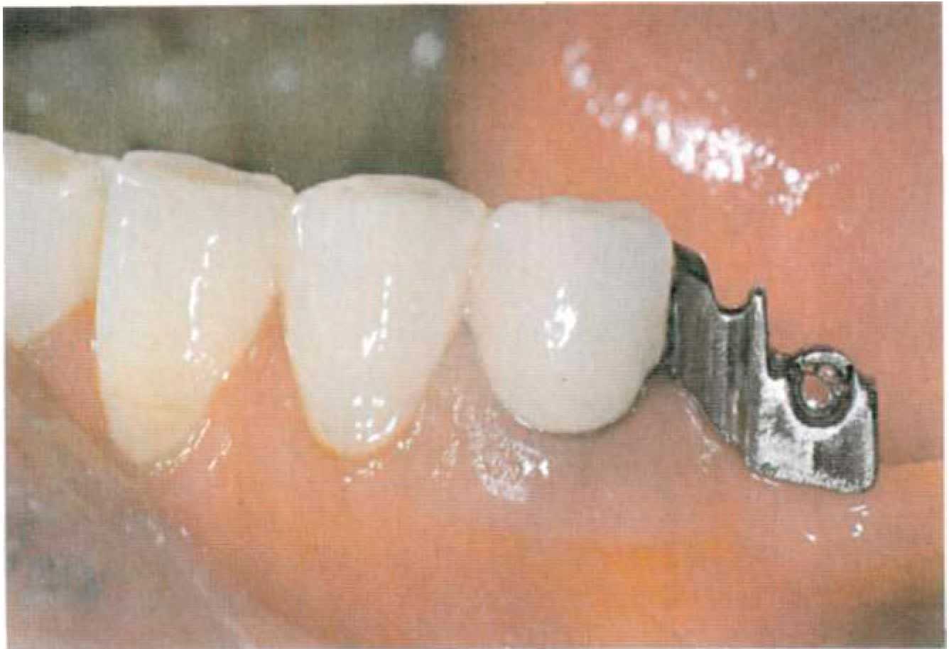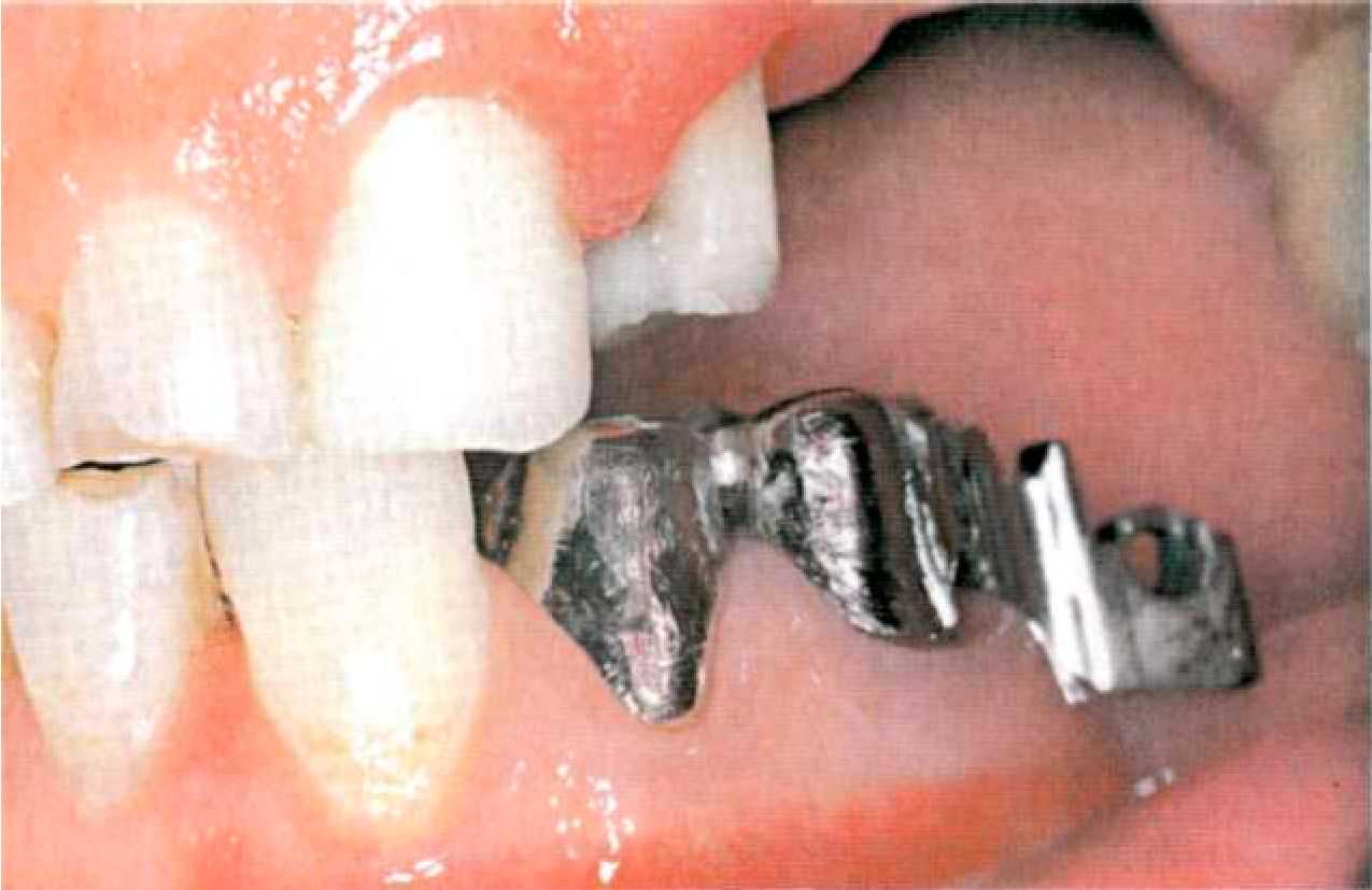 Этап 8. На заключительном этапе проводится проверка готового протеза в полости рта (рис. 116). Оценивают точность посадки аттачмена, проводят коррекцию окклюзионных контактов. Проверяют функции аттачмена (изначально он не должен быть активирован). Цементирование несъемной конструкции осуществляют под контролем надетой съемной части. Между патрицей и матрицей должен быть помещен вазелин для предотвращения попадания цемента.