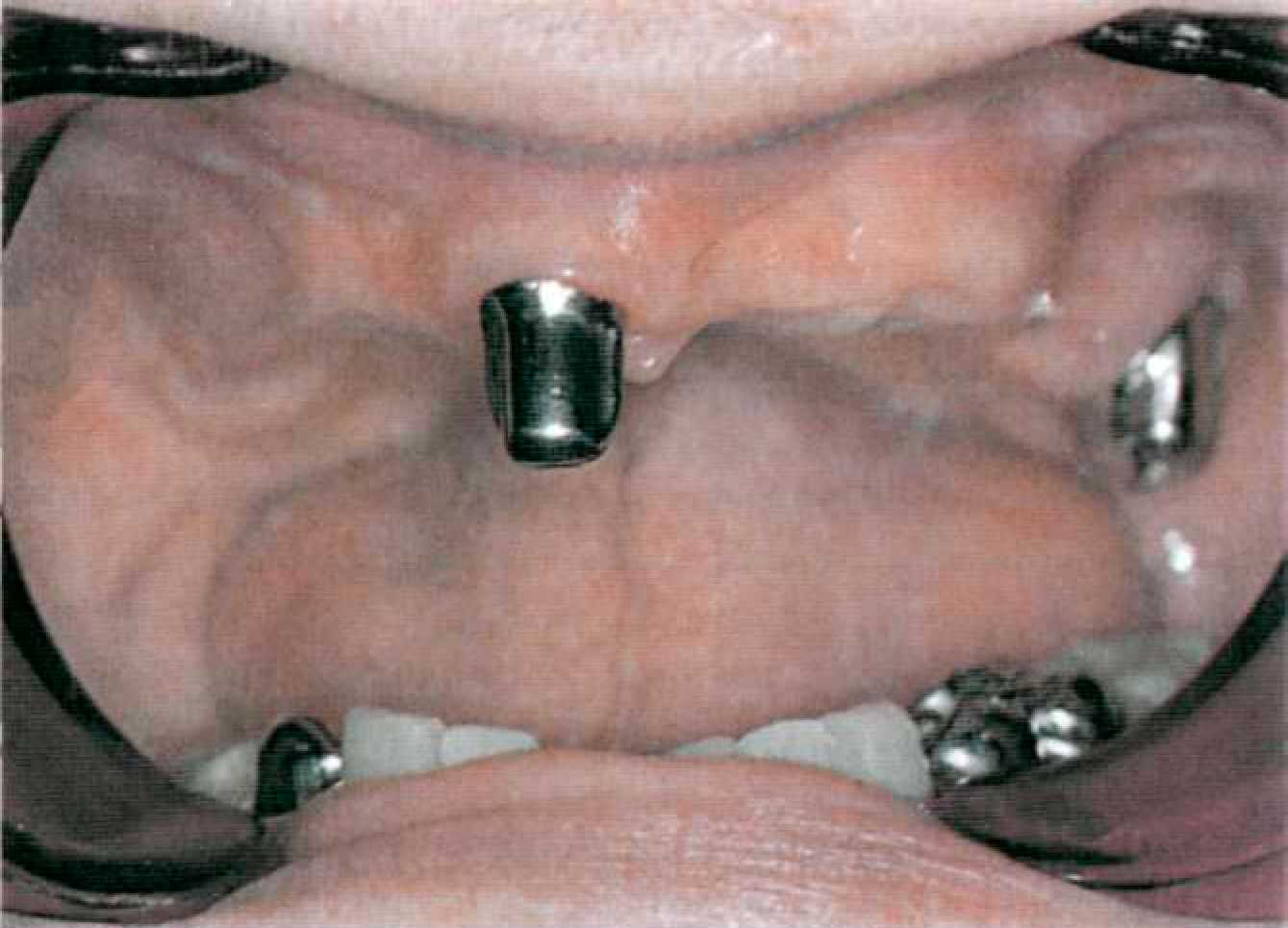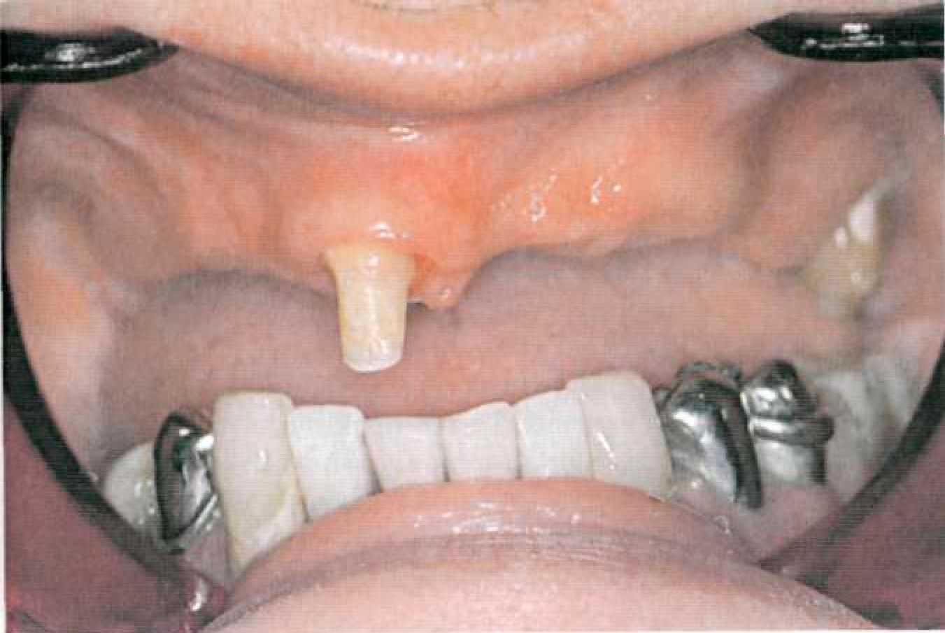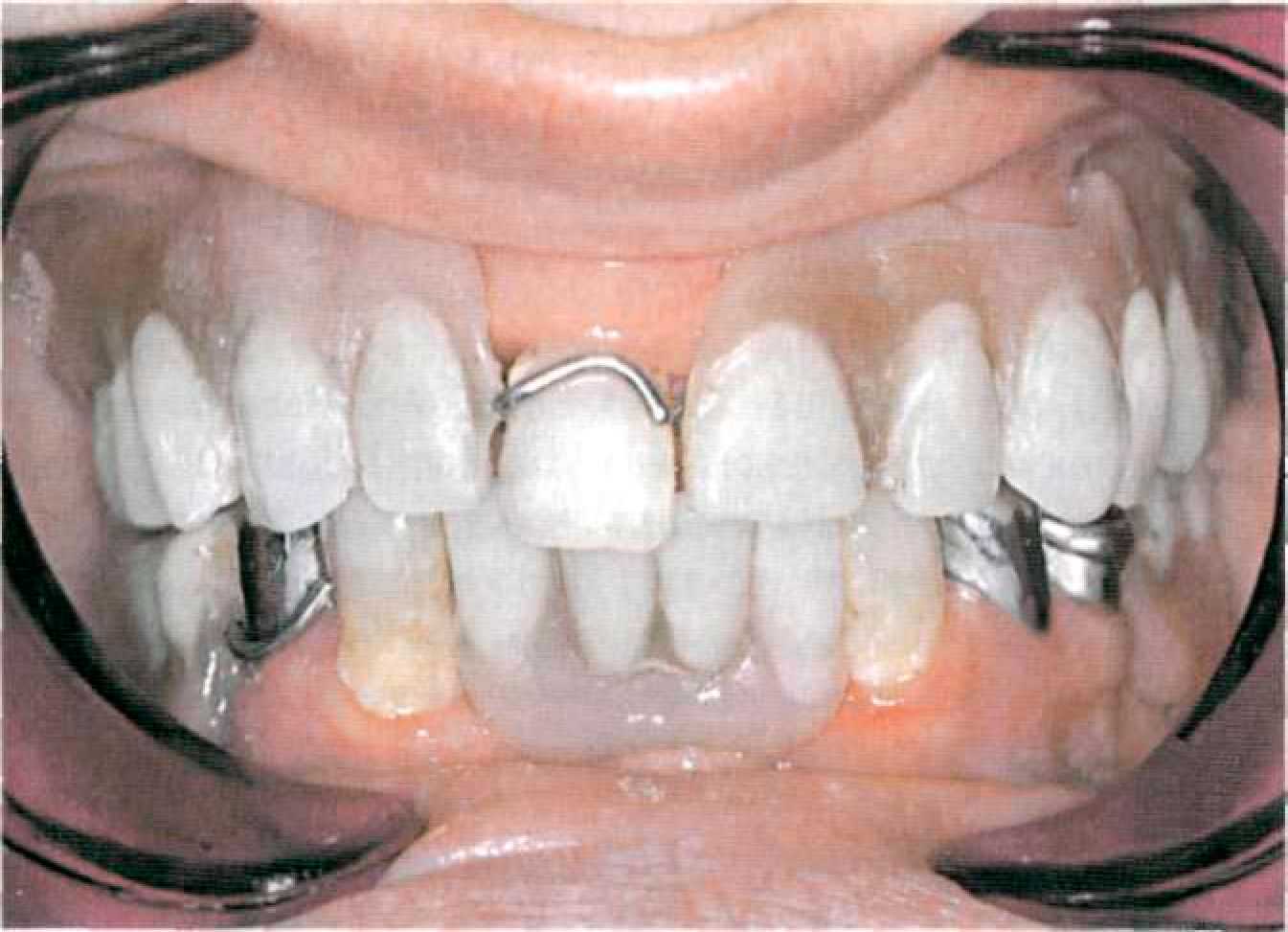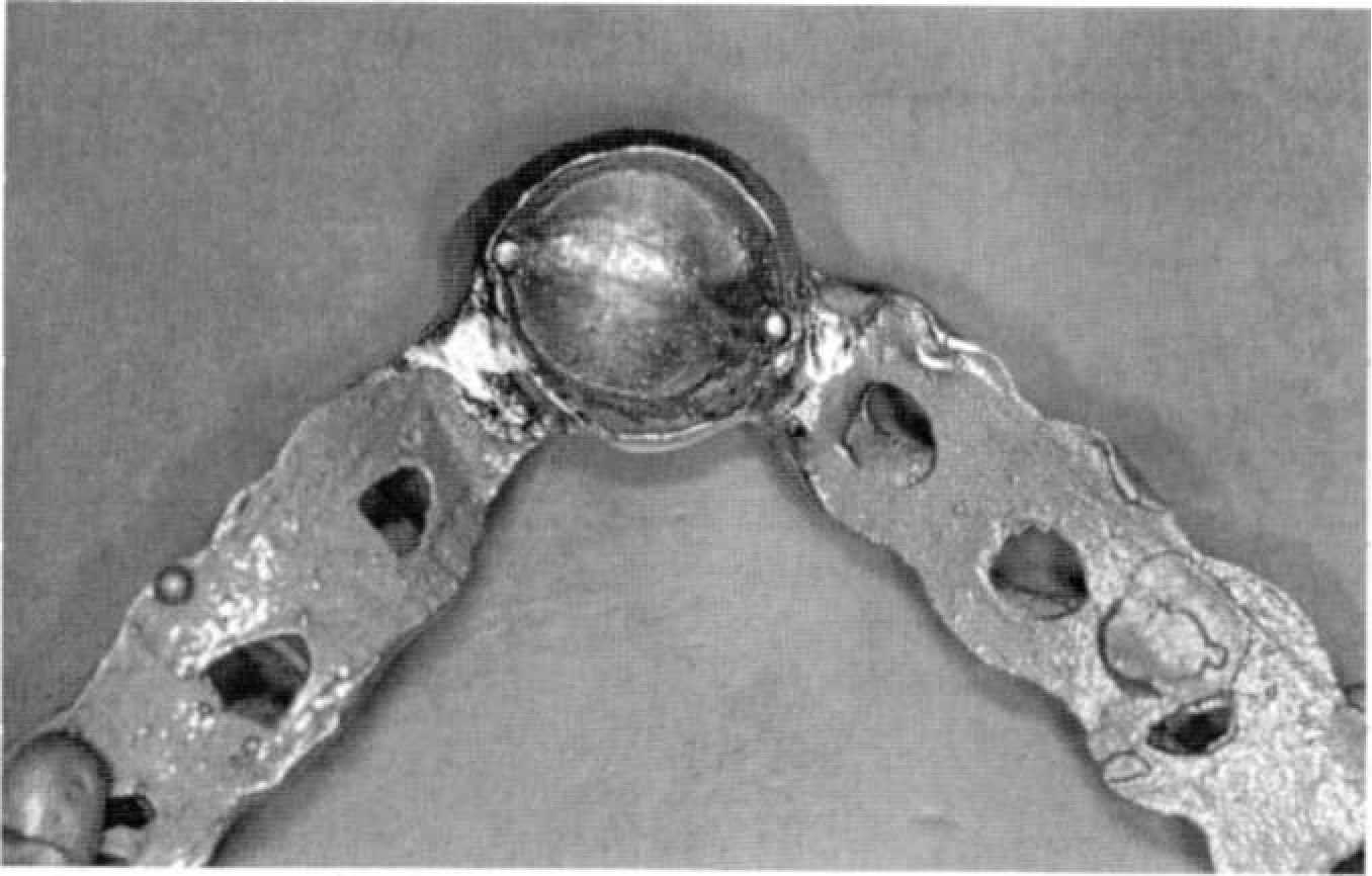 Этап 14. После наложения протеза проводят коррекцию окклюзии и фиксируют первичные коронки на цемент поочередно под контролем покрывного протеза (рис. 144, 145). После фиксации пациента обучают снятию и наложению покрывного протеза, гигиеническим мероприятиям. Уведомляют о необходимости регулярного (каждые 6 месяцев) диспансерного наблюдения у стоматолога. Коррекции базиса покрывного протеза проводят традиционным способом. При необходимости на этапах диспансерного наблюдения проводят перебазировку базиса покрывного протеза. Для этого корригирующим силиконовым оттискным материалом сначала определяют участки атрофии костной ткани. Чаще всего эти участки располагаются по вестибулярной поверхности альвеолярных гребней, так как известно, что наибольшее воздействие оказывают боковые смещения базиса протеза. После этого проводят непосредственно перебазировку (прямым или лабораторным способом).