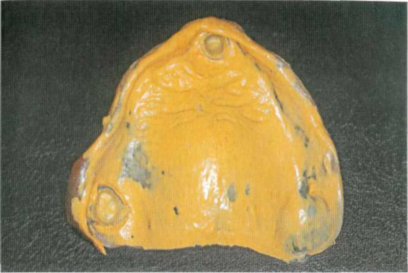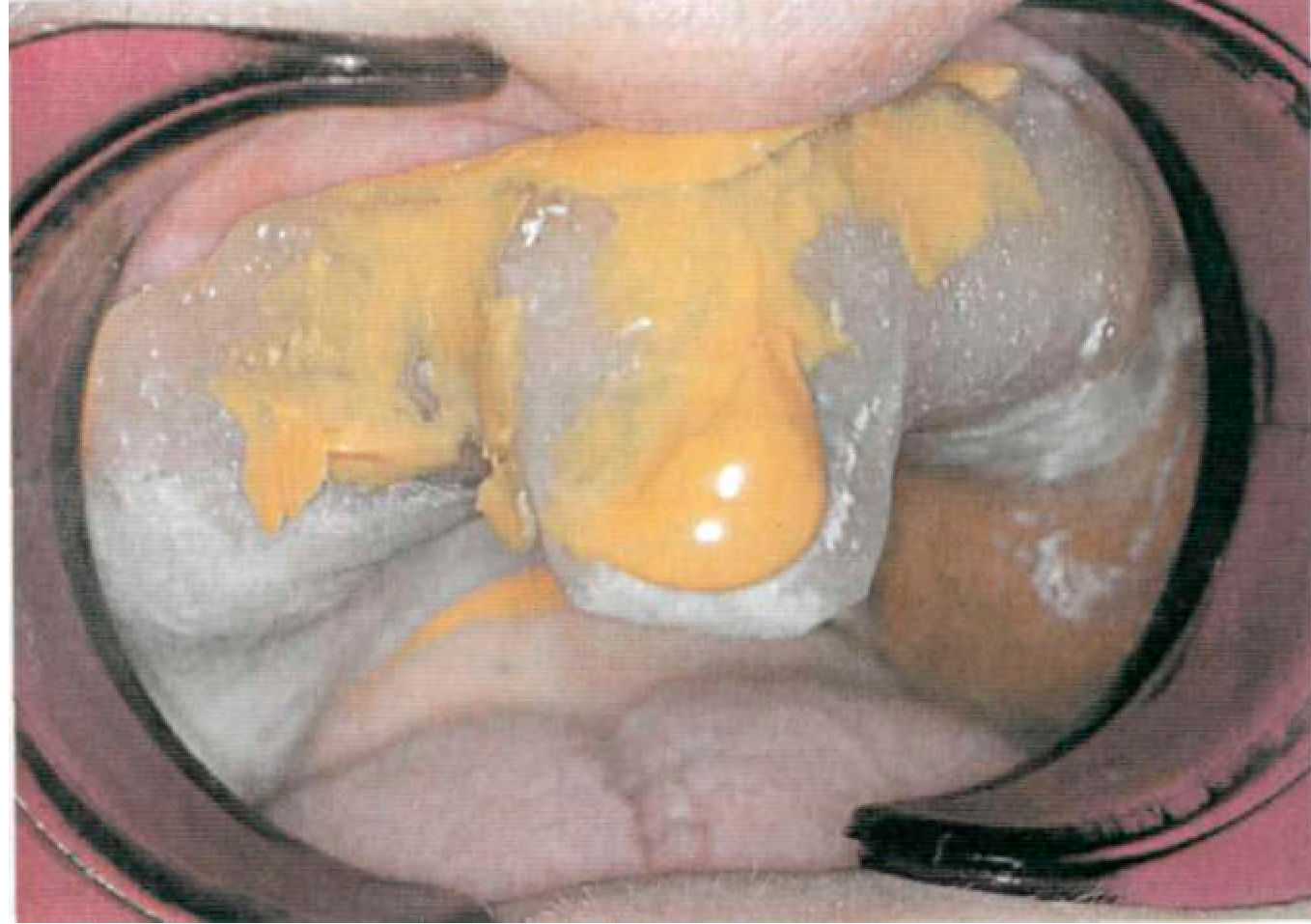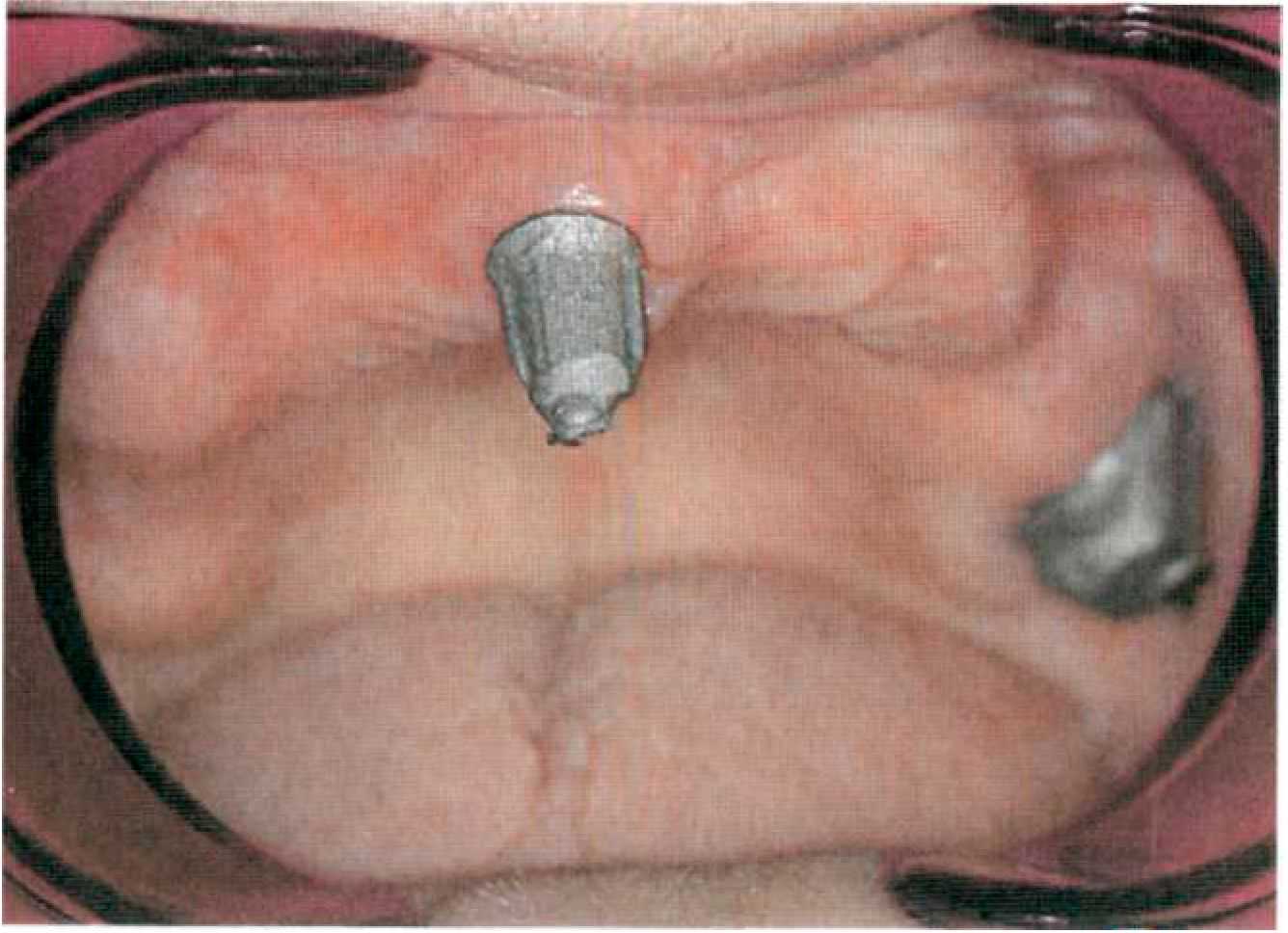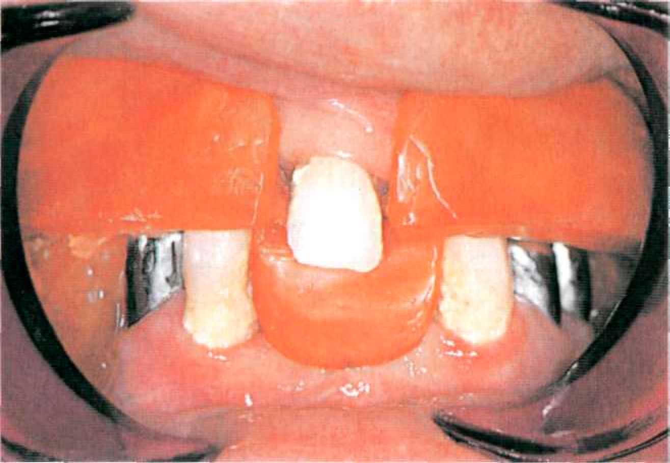 Этап 14. После наложения протеза проводят коррекцию окклюзии и фиксируют первичные коронки на цемент поочередно под контролем покрывного протеза (рис. 144, 145). После фиксации пациента обучают снятию и наложению покрывного протеза, гигиеническим мероприятиям. Уведомляют о необходимости регулярного (каждые 6 месяцев) диспансерного наблюдения у стоматолога. Коррекции базиса покрывного протеза проводят традиционным способом. При необходимости на этапах диспансерного наблюдения проводят перебазировку базиса покрывного протеза. Для этого корригирующим силиконовым оттискным материалом сначала определяют участки атрофии костной ткани. Чаще всего эти участки располагаются по вестибулярной поверхности альвеолярных гребней, так как известно, что наибольшее воздействие оказывают боковые смещения базиса протеза. После этого проводят непосредственно перебазировку (прямым или лабораторным способом).