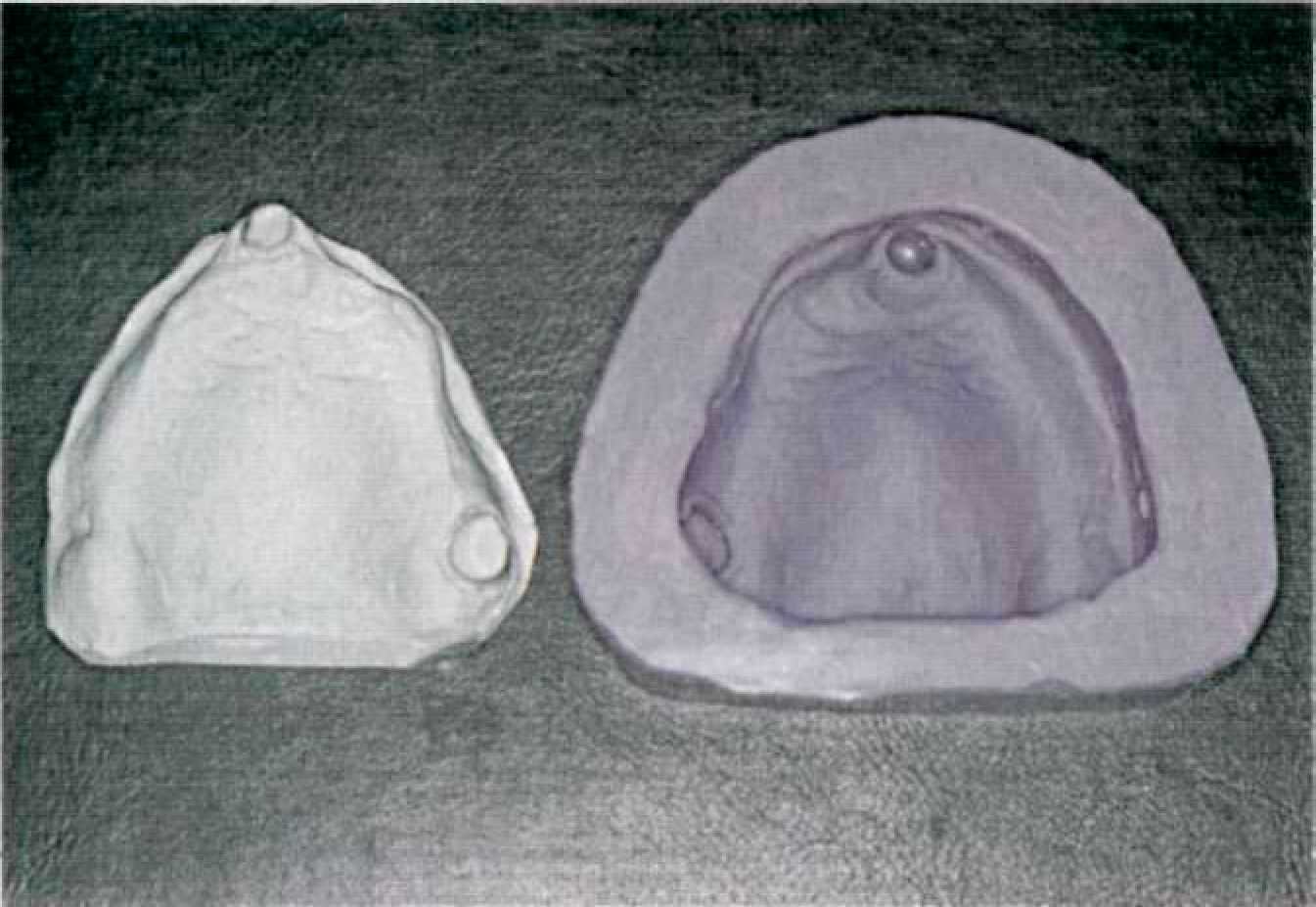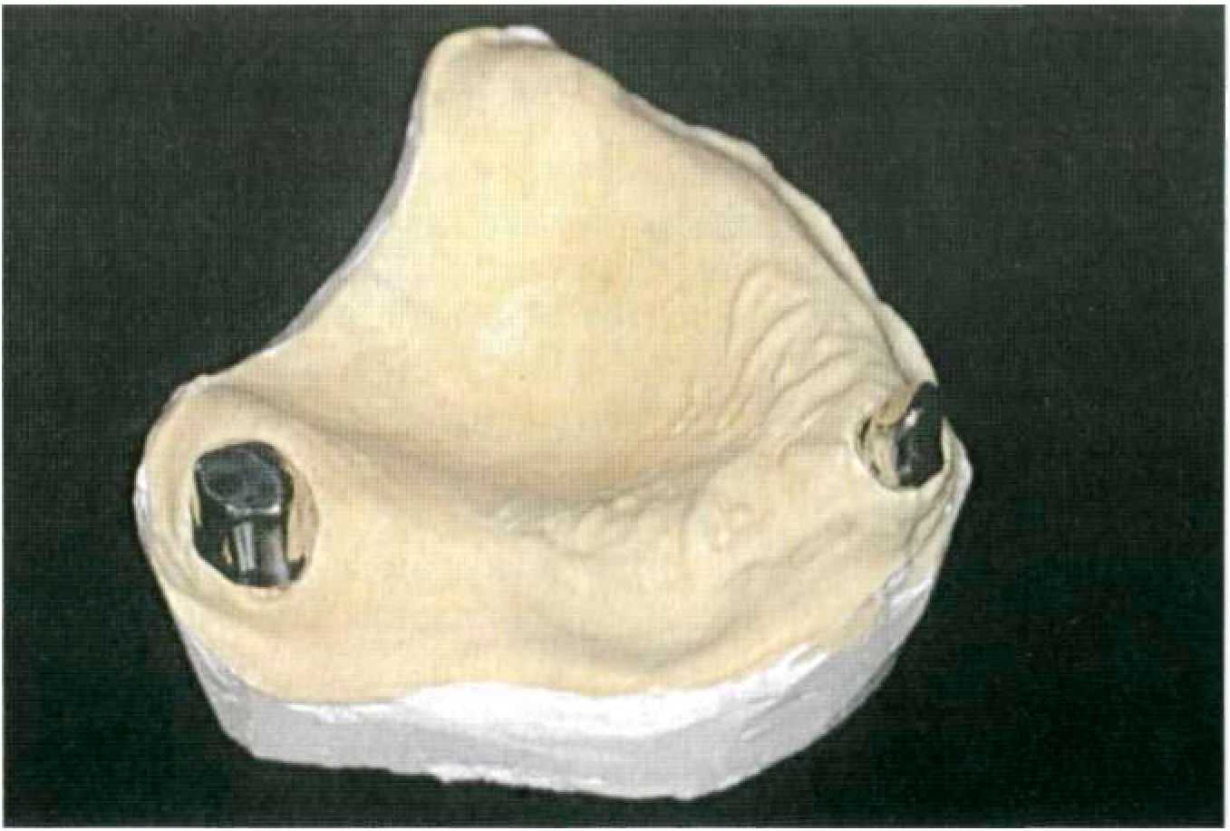 Этап 2. На диагностических моделях изготавливают базисы с окклюзионными валиками и определяют центральное соотношение челюстей (рис. 129) или центральную окклюзию. Этап 3. Анализ диагностических моделей, составление плана лечения и выбор конструкции протеза проводят совместно с зубным техником, который на этом этапе проводит, при необходимости, параллелометрию зубов и альвеолярного гребня. Наличие поднутрений, например грибовидного альвеолярного гребня, может препятствовать наложению будущего съемного протеза, плоскость введения которого определяется отфрезерованной под углом 2° поверхностью первичных коронок. После решения вопроса о выборе конструкции протеза зубной техник приступает к изготовлению временного протеза, которым пациент будет пользоваться в период изготовления постоянного протеза. Это может быть съемная пластиночная конструкция или комбинация несъемной и съемной частей из пластмассы, в зависимости от топографии дефекта и числа оставшихся зубов. Зубной техник изготавливает индивидуальную оттискную ложку с накусочными валиками из воска.