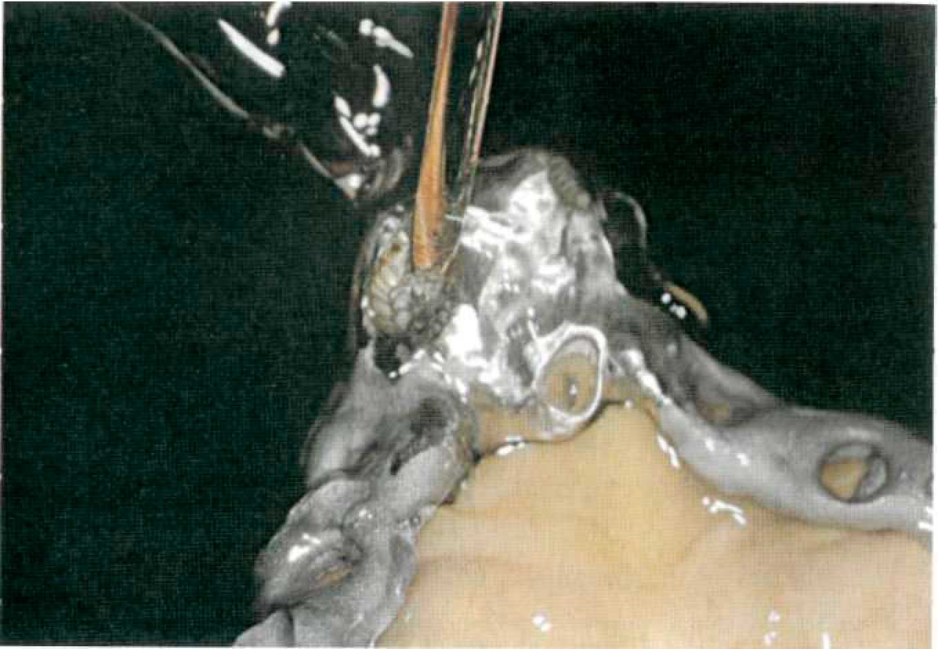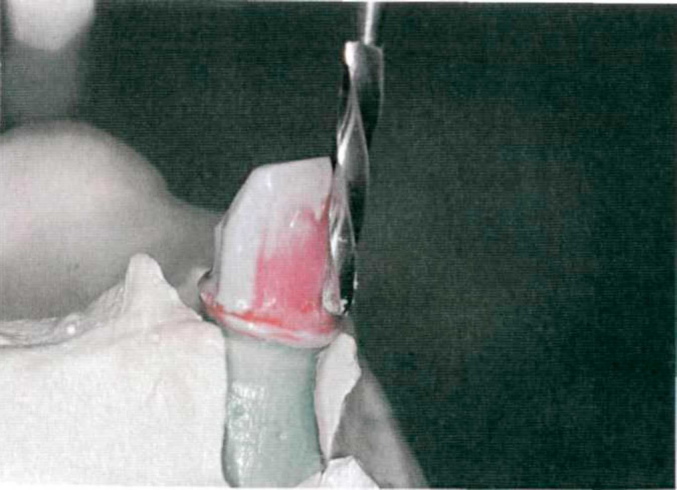 Этап 4. В клинике проводится препарирование опорных зубов с круговым поддесневым уступом 135° и высотой коронковой части не менее 5 мм (рис. 130). Для этого обычно используют алмазные боры №314.697.524 для маркировки кругового уступа, для снятия слоя эмали №314.142.534, для препарирования дентина №314.173.524, для предварительного оформления уступа №314.131.514, для обработки окклюзионной поверхности №314.033.534 (формы рабочей части даны по стандарту ISO). Окончательное оформление уступа проводят микромотором со скоростью вращения до 50000 оборотов в минуту алмазными или лучше твердосплавными борами. Препарирование завершают сглаживанием острых кромок и маркировкой вертикального желобка по месту изготовления фрикционного штифта. Этап 5. Оттиск препарированных опорных зубов и челюстей снимают, используя силиконовый оттискной материал (рис. 131). Оттиск можно снимать индивидуальными ложками корригирующим силиконовым материалом, стандартными ложками в технике двухслойного оттиска или однослойного оттиска (монофазным силиконовым материалом).