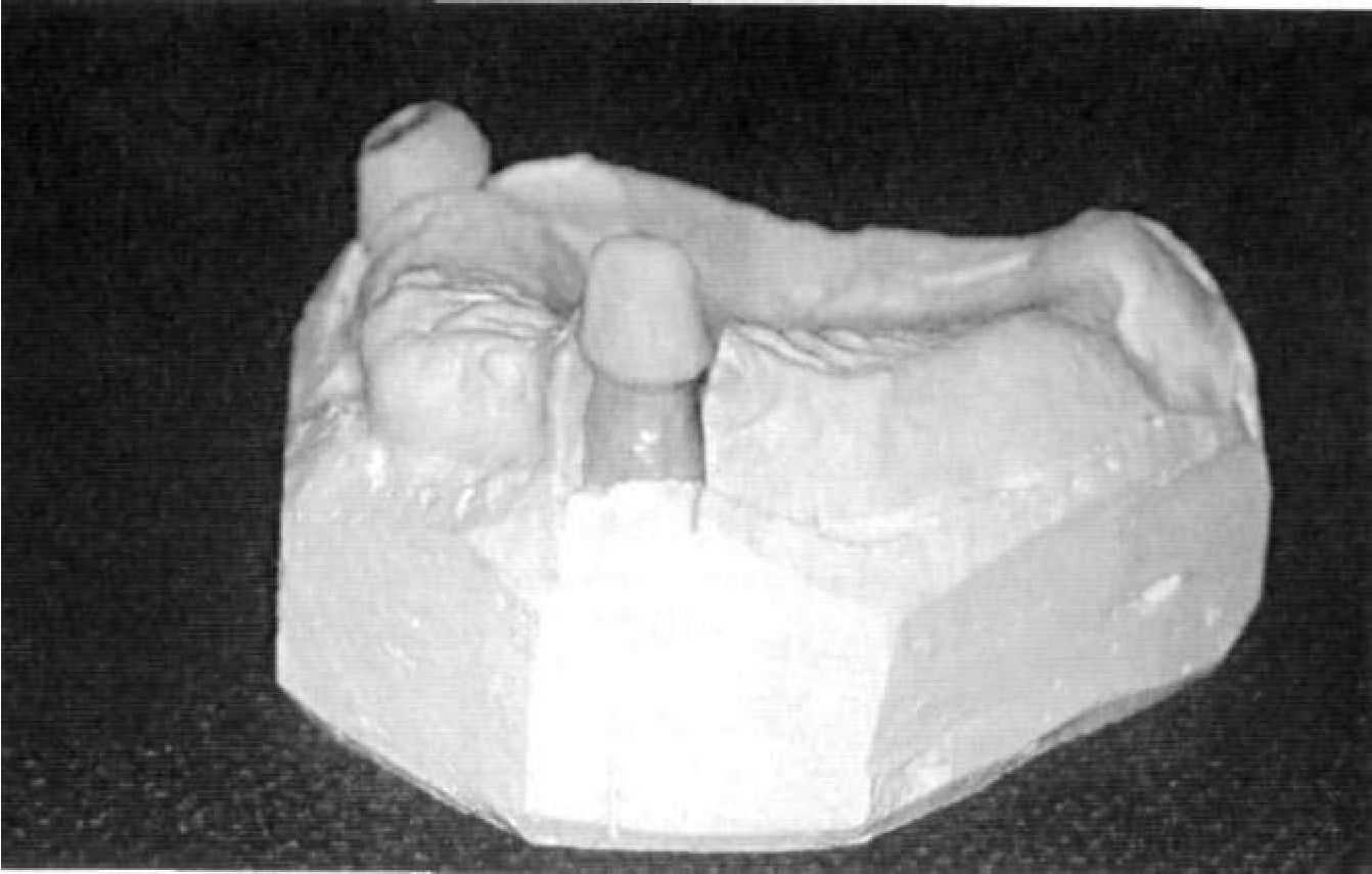 Этап 6. По полученному оттиску зубной техник изготавливает разборную рабочую модель, на которой проводит моделировку первичных коронок с формированием утолщения (1,2 мм) для паза фрикционного штифта (рис. 132). Затем, используя фрезерное устройство, проводится фрезерование до уровня десневого края восковым шабером, имеющим конусность Т (рис. 133). Этап 7. Смоделированную восковую композицию штифтуют и отливают. Для первичных коронок и каркаса покрывного протеза обычно используют один и тот же металлический сплав. После литья первичные коронки припасовывают на модели (рис. 134). Этап 8. В клинике припасовывают первичные коронки на опорных зубах (рис. 135), фиксируют их временно на корригирующую силиконовую оттискную массу и скрепляют коронки между собой пластмассой холодного отверждения, если они находятся в непосредственной близости друг от друга. Для лучшего позиционирования первичной коронки в оттиске, упрощения удержания при припасовке для этого этапа зубной техник оставляет часть литника со сформированной в нем ложбинкой. Оттиск для изготовления металлического каркаса покрывного протеза снимают индивидуальной ложкой аналогичной оттискной массой (рис. 136). Этап 9. Зубной техник подготавливает новую рабочую модель, где четко должны прослеживаться границы будущего покрывного протеза. Затем первичные коронки с помощью специального приспособления переносятся на площадку для фрезерования, где проводится фрезерование твердосплавными фрезами с конусностью Т и закругленным торцом. После фрезерования первичные телескопические коронки полируют тонкодисперсной алмазной пастой (рис. 137). Этап 10. Рабочую модель с первичными коронками готовят к дублированию силиконом и изготавливают огнеупорную модель из специальной массы, например из массы «Deguvest» (рис. 138).
