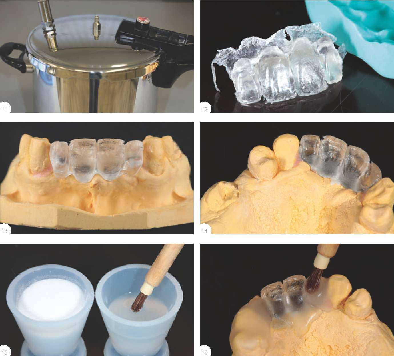 | Наша задача теперь - перевести восковую репродукцию в пластмассу. Манипуляции здесь довольно простые. Мы изолируем модель (рис. 6), заполняем силиконовый ключ прозрачной пластмассой (рис. 7-8). Это могут быть Transparent Clear, AnaxDent Clear или KFO фирмы Bredent - очень удобные пластмассы, которые я использую для изготовления шаблонов. |