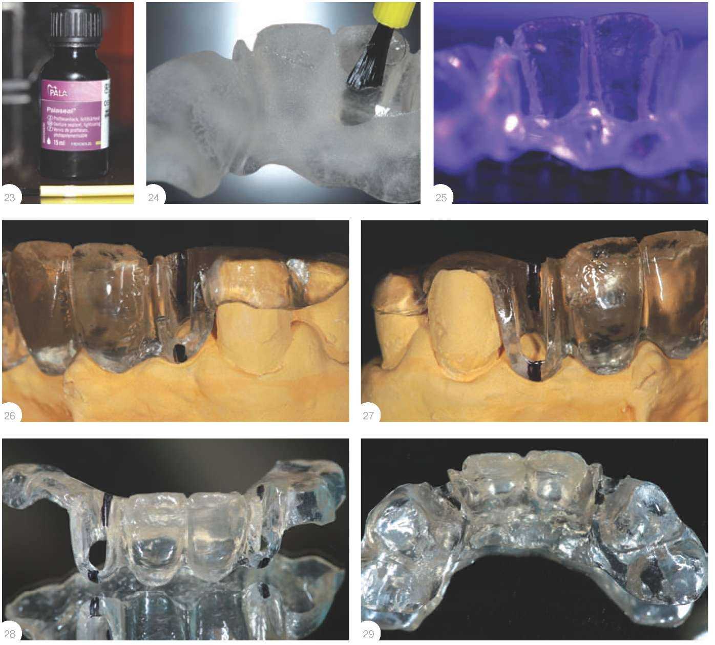 Я пользуюсь Полисилом (рис. 23), он позволяет закрыть все поры, загерметизировать и создать ровную глянцевую поверхность. Равномерно покрываем поверхность с обеих сторон (рис. 24) и засвечиваем (рис. 25). Полимеризация тоже должна проходить с обеих сторон, чтобы не осталось сырого материала. Рис. 26-27. Готовый шаблон, установленный на модели. Хорошей подсказкой может служить маркировка (рис. 26-29), для чего используется черный водостойкий маркер. Маркировка проводится после дезинфицирующей обработки. Это нужно, т. к. в момент операции как только на шаблон попадает кровь, он сразу становится практически невидимым во рту. Работа готова... l a b Рис. 28-29. Промаркированный шаблон готов к передаче врачу. |