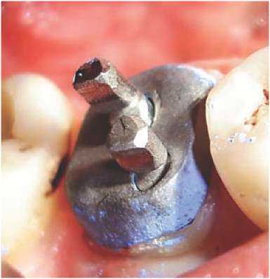 Во время следующего визита временная конструкция, пломба или GC Triage при помощи ультразвукового наконечника удаляются. Готовая цельнолитая культевая штифтовая вкладка примеряется, как правило, без затруднений и фиксируется в полости корня. Для этих целей мы используем усиленные композитом стеклоионо-мерные цементы GC Fuji Plus или GC FujiCem, обязательно применяется специальный кондиционер для дентина - GC Fuji Plus Conditioner, что значительно увеличивает прочность фиксации. Важно отметить, что это правило распространяется и на совместное применение GC FujiCem и GC Fuji Plus Conditioner.