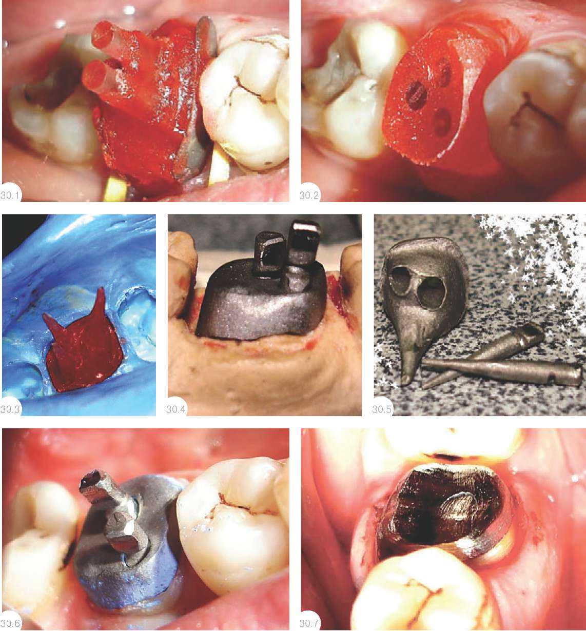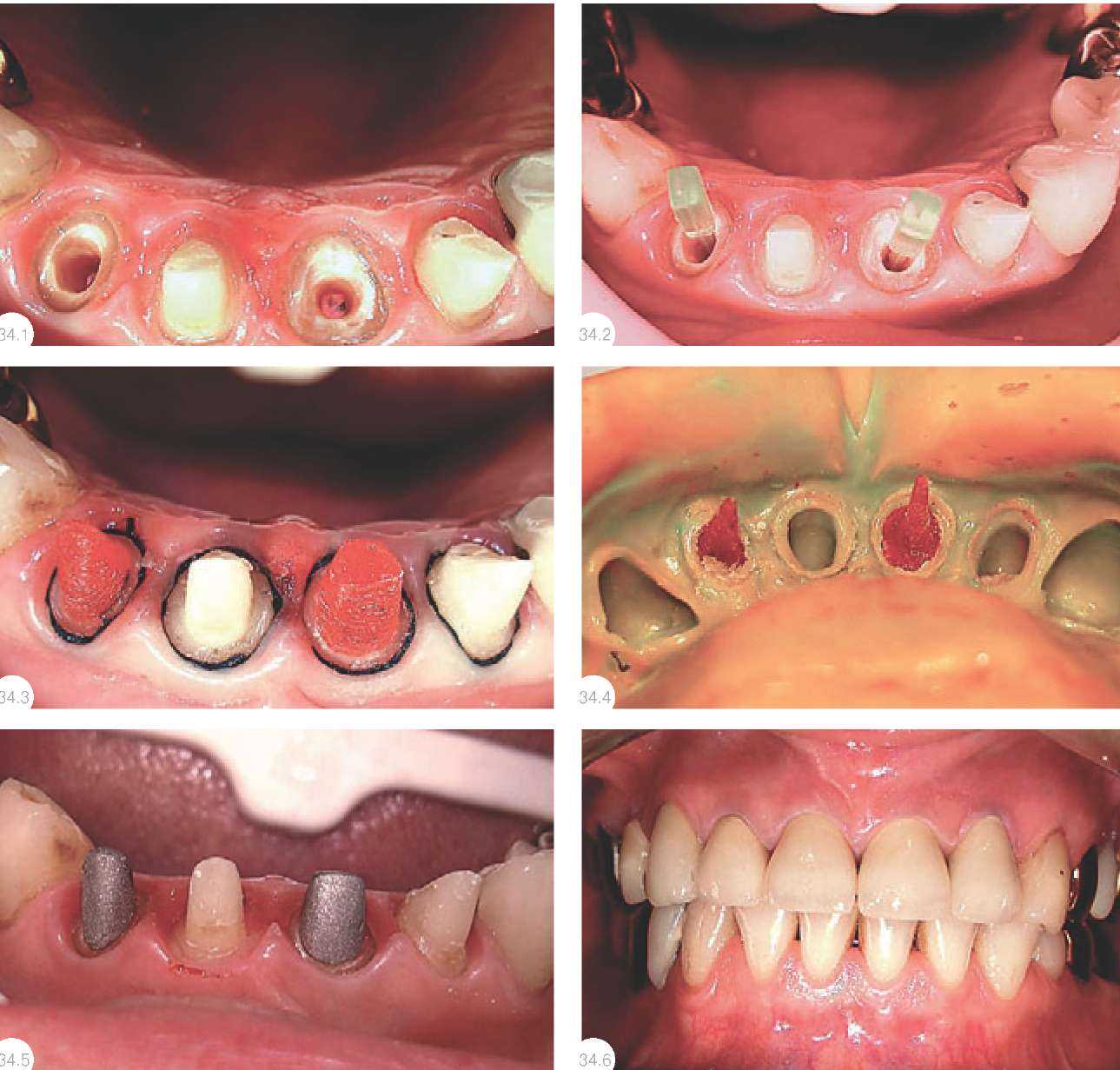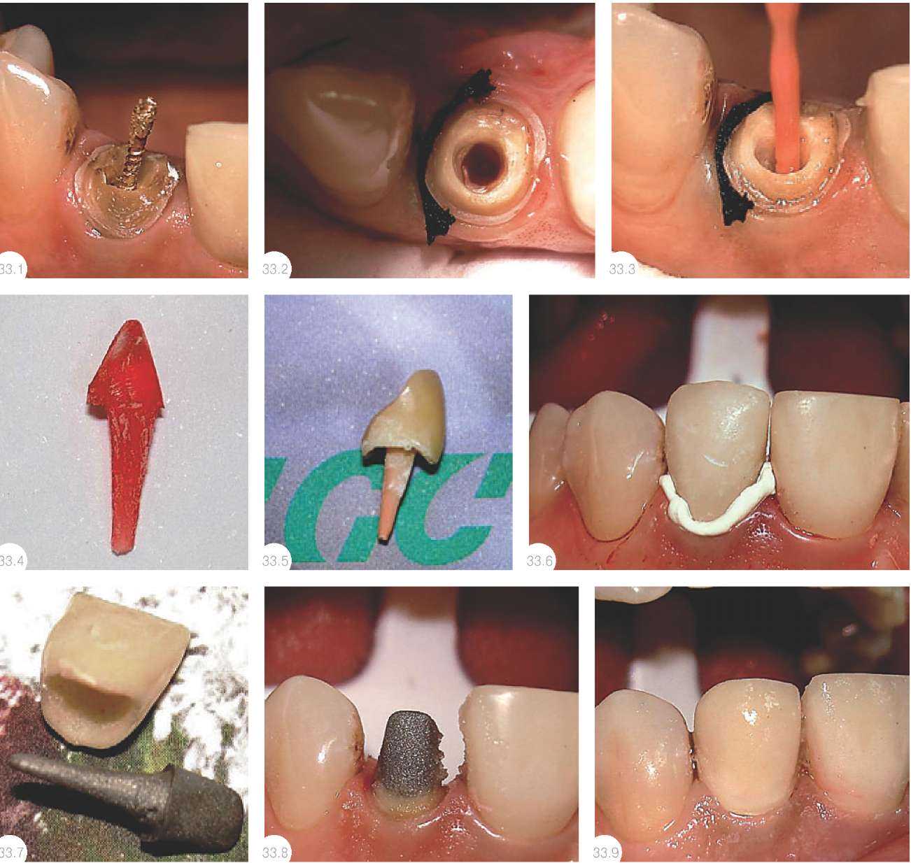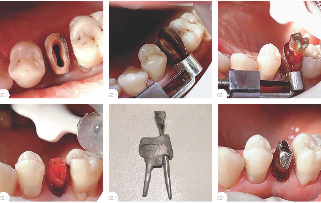 | Рис. 32. Клинические этапы замещения дефекта коронковой части зуба 15 цельнолитой культевой штифтовой вкладкой. Фиксация в полости рта на корне зуба 15 с применением усиленного композитом СИЦ GC Fuji CEM |