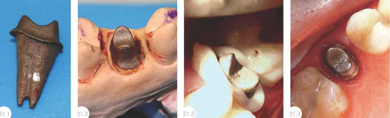 | Рис. 31.1. ЦКВ изготовлена из золотосодержащего сплава для фиксации на корне зуба 25 с овальным на поперечном срезе корневым каналом, с раздвоением в средней трети на два самостоятельных корневых канала Рис. 31.2. Вид ЦКВ на гипсовой модели Рис. 31.3-31.4. ЦКВ зафиксирована в полости рта на GC Fuji Plus (СИЦ для фиксации ортопедических конструкций, усиленный композитом) |