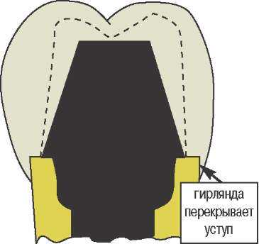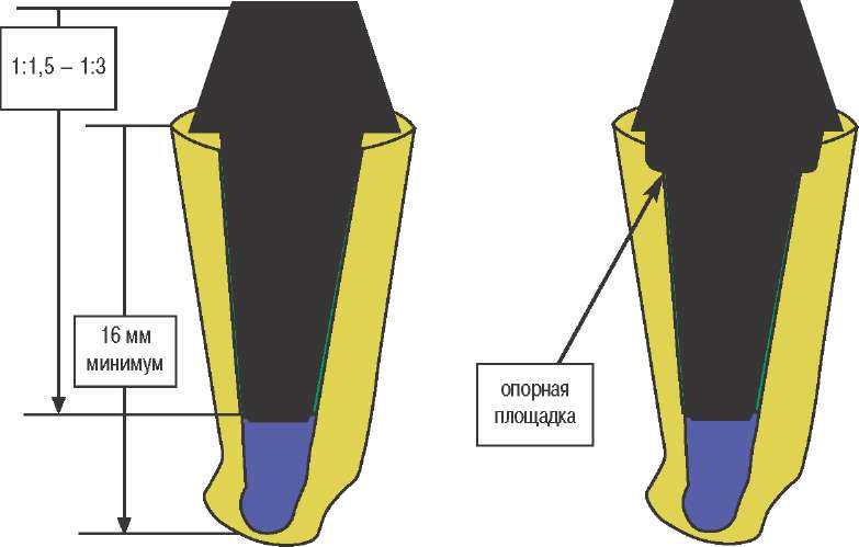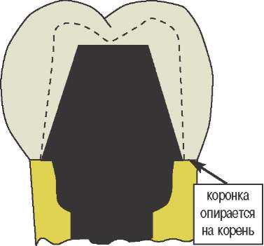 Уровень уступа должен находиться на уровне десневого края. Это позволяет избежать к следующему визиту стойкого, практически необратимого наплыва на уступ маргинальной десны. Острые ослабленные края разрушенного зуба срезаются и заполиро-вываются, создается горизонтальная площадка. В пришеечной части корневого канала формируется ретенционная опорная площадка - на низкоскоростном наконечнике толстым фиссурным бором с закругленным кончиком (красное и желтое кольцо). Если зуб разрушен до уровня маргинальной десны, то опорную площадку лучше не формировать и тем самым не ослаблять и без того тонкие стенки корня, но тогда поперечный срез штифтовой части вкладки должен иметь отличную от круглой форму. Это предотвратит возможную в дальнейшем ротацию ЦКВ. Необходимо учитывать, что будущая коронка должна опираться на уступ, сформированный на корне зуба (рис. 4).