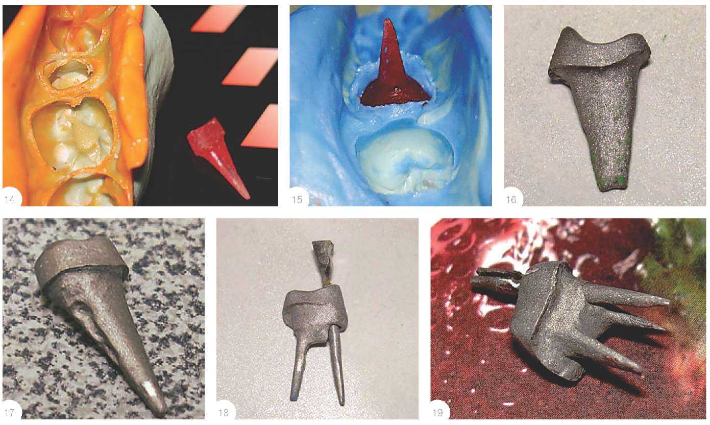 | Рис. 33. Этапы восстановления культевой части разрушенного зуба 22 цельнолитой культевой штифтовой вкладкой |