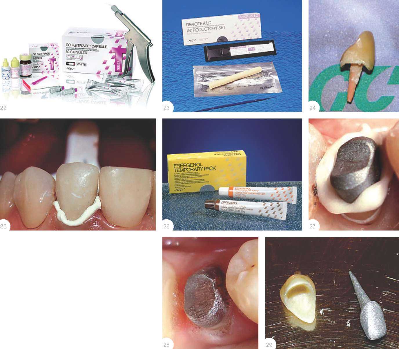 | Рис. 22. GC Triage - СИЦ с уникальными свойствами, одно из показаний - временное пломбирование полости корня зуба на этапах лечения Рис. 23. GC Revotek LC - специальный гелиокомпозит для изготовления временных ортопедических конструкций методом моделирования Рис. 24. Пластмассовый штифтовой зуб, временная конструкция Рис. 25. Пластмассовый штифтовой зуб на корень 22, фиксация в полости рта на временный безэвгенольный цемент GC Freegenol Рис. 26. Временный цемент GC Freegenol Рис. 27-28. ЦКВ зафиксирована в полости рта на за зубе 45 с применением GC Fuji Plus Рис. 29. ЦКВ и лабораторно изготовленная временная коронка |