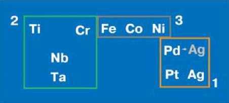ДЕНТАЛЬНЫЕ СПЛАВЫ На рисунке 1 представлен раздел из периодической системы Д.И. Менделеева. Он разделен на 3 группы, содержащие основные элементы, которые могут быть применены для изготовления металлических дентальных материалов, базируясь на вышеперечисленных критериях. Группа 1 содержит драгоценные металлы: золото, платину, палладий. Благодаря своей высокой коррозийной устойчивости драгоценные металлы являются идеальной базой для зубного протезирования. Относящееся к драгоценным металлам серебро занимает двоякое положение: как элемент с низким коэффициентом коррозийной устойчивости в человеческом организме и как великолепный компонент дентального сплава.