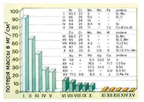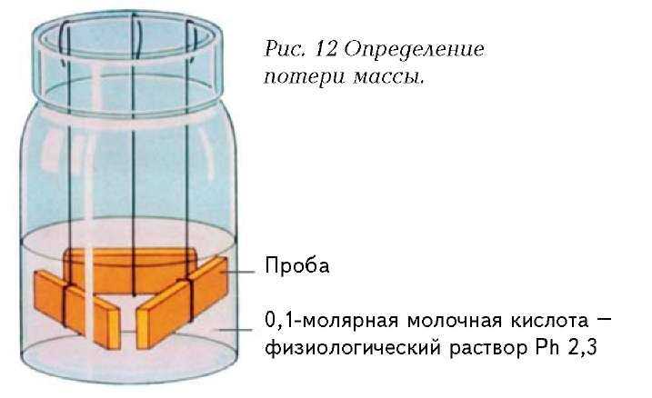 | Рис. 15. Определение коррозии (потеря массы) металлических дентальных материалов по Kappert. Электролит: 0,1-молярная молочная кислота — физиологический раствор Ph 2,3; продолжительность 7 дней. |
