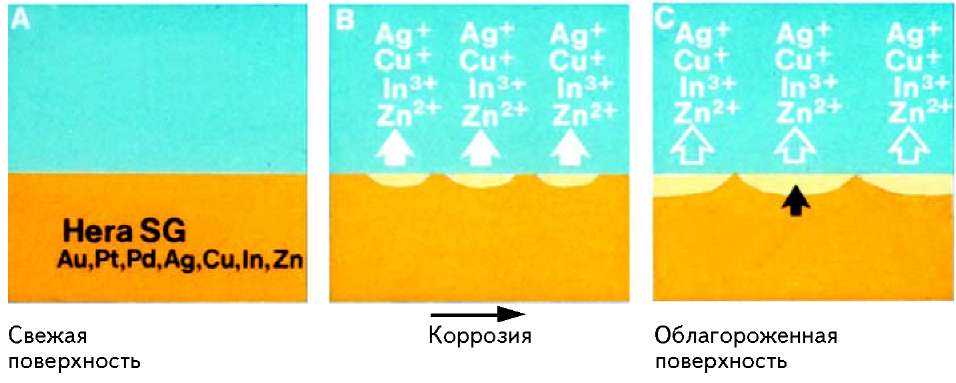 | Рис. 17. Схематическое изображение коррозионного процесса сплавов из благородных металлов. |