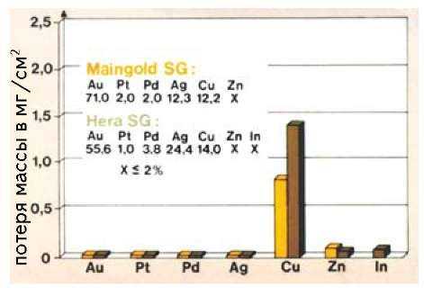 | Рис. 14. Результаты коррозии (потеря массы) сплавов из благородных металлов Maingold, SG, Hera SG Электролит: 0,1-молярная молочная кислота — физиологический раствор Ph 2,3; продолжительность 7 дней. |