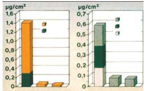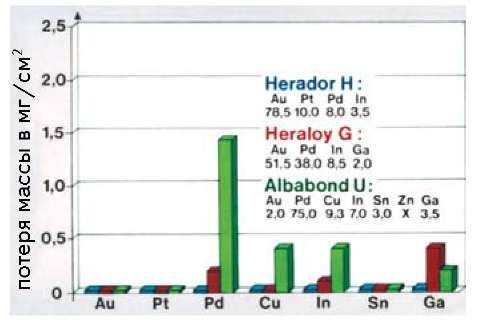 | Рис. 13. Результаты коррозии (потеря массы) сплавов из благородных металлов под облицовку керамикой Herador H, Heraloy G, Albabond U. Электролит: 0,1-молярная молочная кислота — физиологический раствор Ph 2,3; продолжительность 7 дней. |