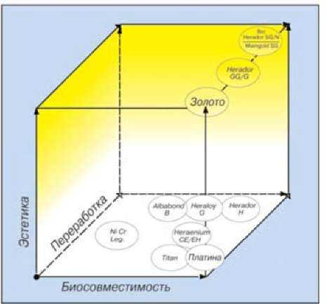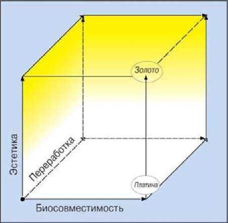 К группе 2 относятся самопроизвольно пассивируемые металлы, такие как титан, хром, никель и тантал. Самопроизвольная пассивация вызывается реакцией кислорода из воздуха с элементами. Оксидная пленка способствует высокой коррозийной устойчивости по отношению к жидкостям человеческого организма. Хром не относится к дентальным сплавам из-за своей экстремальной хрупкости. Ниобий и тантал в связи с экстремально высокой температурой плавления (более 2000 °С) очень трудно обрабатываются при изготовлении из них зубного протеза. Аналогично и титан. Поэтому титан и его сплавы рекомендуются для имплантатов. К группе 3 относятся железо, кобальт и никель. Эти элементы не коррозируют в полости рта. При добавлении хрома и молибдена существенно увеличивается коэффициент коррозийной устойчивости. Специальные кобальтовые сплавы (например, Heraenium CE, EH, NF) обладают превосходными физическими и химическими свойствами, что позволяет им найти свое широкое применение при изготовлении съемных зубных протезов. Спектр никель-хром-молибденовых сплавов, имеющихся сегодня на рынке, четко указывает на более высокую долю коррозии в искусственных растворах смолы, чем кобальтовые или сплавы из драгоценных металлов. К тому же никель обладает высоким сенсибилизирующим потенциалом, который может вызвать аллергию у пациентов. СПЛАВЫ ИЗ ДРАГОЦЕННЫХ МЕТАЛЛОВ Описанный выше спектр требований к дентальным материалам в полной мере относится и к применению металлических дентальных структур. Рисунок 2 отображает при помощи векторов картину критериев: биосовместимость-обработка-эстетика, благодаря которым зубной техник и потребитель может различать всевозможные типы сплавов. Позиция, помеченная звездочкой, соответствует оптимальным свойствам материалов. На примере золота и платины показано, как и по каким критериям распределяются материалы в этой группе.