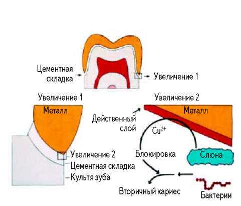 Подобные эксперименты (рис. 14) проводились со сплавами Maingold SG (сплав с высоким содержанием золота) и Hera SG (сплав с редуцированным содержанием золота). В процессе их проведения отмечено освобождение небольшого количества ионов меди и цинка. В результате экспериментов и исследований «in vitro» получили показатели, поддающиеся оценке. В стенах лабораторий и университетов проанализированы различные дентальные материалы. На рисунке 15 представлена таблица с результатами исследований NiCrMo-, CoCrMo — сплавов, а также сплавов с содержанием драгоценных металлов. Сплавы I-V представляют собой NiCrMo-сплавы с различным химическим составом. У них отмечается самая высокая коррозийная устойчивость. Особенно четко это прослеживается на сплавах с содержанием бериллия в процессе образования NiBe-фазы. Кроме этого, сам зубной техник подвергается вредному воздействию пыли, содержащей бериллий и обрабатывающихся во время механической обработки металлических каркасов из сплавов с содержанием бериллия. Сплавы VI-X наглядно демонстрируют коррозионное воздействие CoCrMo-сплавов. Здесь показатели лучше, чем у NiCrMoсплавов. Причиной этому являются показания к применению данного типа сплава преимущественно для изготовления съемного протеза. Сплавы с высоким и редуцированным содержанием золота, а также керамические сплавы на базе палладия представлены под номерами XI — XV. Следующим интересным аспектом исследований является коррозионное воздействие дентальных сплавов с содержанием драгоценных металлов как функции времени. В этом случае пробы сплавов удалялись из раствора на следующий день и анализировались спектроскопическим методом на наличие ионов металлов. Неизмененные пробы снова помещали в раствор на 3 дня и анализировали. На рисунке 16 показаны сплавы Bio Maingold SG и Hera KF. Освобождение ионов таких компонентов как медь, олово, индий выше только в первый день эксперимента. На второй и третьей фазах величина освобождения ионов металлов минимальна. Следует прокомментировать результат этого исследования сплавов с высоким и редуцированным содержанием драгоценных металлов (минимальное содержание золота и платины — 50% от веса). Ионы недрагоценных металлов у таких сплавов освобождаются только с поверхности. Этот процесс долговременный и приводит к обогащению поверхности сплава золотом и платиной. Сплав, а, следовательно, и сам зубной протез, улучшают свои качества по отношению к организму, т.е. повышается их коррозийная устойчивость (рис. 17). АНТИБАКТЕРИАЛЬНОЕ ВОЗДЕЙСТВИЕ ИОНОВ МЕДИ Освобождение ионов меди в небольших количествах следует рассматривать как преимущество и только с точки зрения антибактериального воздействия. Этот эффект был исследован при помощи Lactobacillaceae на сплавах с содержанием меди и без содержания меди, таких как Maingold-, Hera- и Aurea- сплавы (рис.18). При взаимодействии сплава с питательной средой ионы меди проникают в клетки и убивают бактерии, создавая защитную зону против их роста. Чем больше диаметр этой зоны, тем сильнее антибактериальное воздействие сплава. Интересным представляется также и тот факт, что кондиционирование поверхности сплава оказывает существенное влияние на антибактериальное воздействие. На рисунке 19 видны результаты. Очевидно, что сплавы с содержанием меди демонстрируют антибактериальный эффект, сплавы без содержа