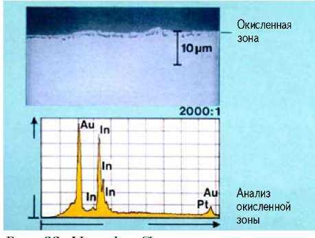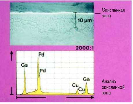 ем золота, где четко видна оксидная зона, состоящая из оксидов индия. Эта зона у таких сплавов, как правило, имеет толщину приблизительно 1 мкм. Такая малая толщина дает возможность зубному технику удалить оксиды в процессе полировки. Это является основанием для применения керамических сплавов с высоким содержанием золота, что практически исключает патологические явления на десне. Другую картину соотношения окисления можно наблюдать на сплавах с содержанием палладия (рис. 24). Верхняя часть рисунка показывает нам оксидную зону, которая делится на две части: с внешней стороны тонкую и с внутренней стороны - толщиной до 20 мкм. Речь идет в данный момент об оксидах меди и галлия. Удалить внешнюю оксидную зону зубной техник в состоянии только лишь в процессе |