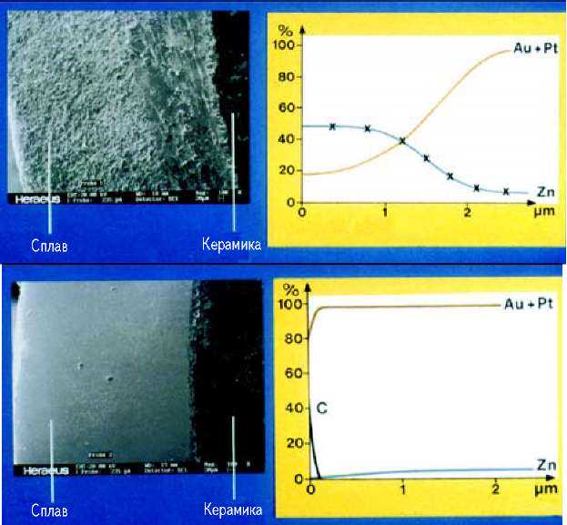 полировки края коронки. Внутренняя же остается невредимой и после посадки коронки в полость рта образовывает резервуар легкорастворимых оксидов, которые предпочтительно откладываются в переходной складке, а затем и в десне. Эта реакция может быть предотвращена в процессе заключительного протравливания коронки. Влияние на оксиды протравливания на краю коронки показано на рис. 25, 26. Левая часть рис. 25 демонстрирует поверхность оксидированного края коронки керамического сплава Herador PF с высоким содержанием золота. Правая часть рисунка — продольный разрез, который был изготовлен при помощи протравливания газом аргоном, а также в процессе анализа по Аугеру. Оксид цинка четко просматривается по краю коронки (высокая концентрация цинка). В связи с этим на поверхности прослеживается низкая концентрация золота и платины. После удаления верхних слоев с поверхности концентрация цинка падает соответственно данному типу сплава, а концентрация золота и платины повышается до заданной величины. В этом случае толщина оксидной зоны составляет приблизительно 2 мкм.