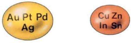 Функции компонентов сплава: Аи — устойчивость к коррозии и среде ротовой полости, цвет Pt — устойчивость к коррозии и среде ротовой полости, твердость, глобулярное затвердение Pd — устойчивость к коррозии и среде ротовой полости, к сдавлению Ag — твердость, литье, пайка, прочность Си — твердость, прочность, литье, пайка, цвет Zn — литье, твердость, дезоксидация In — твердость, литье, прочность Sn — литье, твердость, прочность