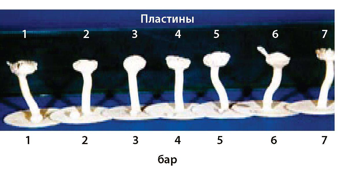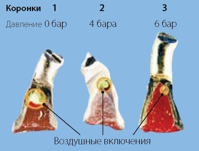 Пластина 1 заформована при атмосферном давлении - Пластина 2 заформована под давлением ^ 2 бара - Пластина 3 заформована под давлением ^ 3 бара - Пластина 4 заформована под давлением ^ 4 бара - Пластина 5 заформована под давлением ^ 5 бар - Пластина 6 заформована под давлением ^ 6 бар - Пластина 7 заформована под давлением ^ 7 бар Становится очевидным, что всегда одинаковые по размеру искусственно созданные воздушные поры при повышении давления уменьшаются в размере, исчезая полностью при давлении ровно 7,4 бара. Если мы нанесем такие же воздушные поры на стенки восковых моделей коронок, то после литья увидим на первой коронке слева (коронка 1) результат формовки без давления. Эта коронка для дальнейшей работы непригодна. Коронка 2 была заформована под давлением 4 бара. Однако «жемчужина» на месте воздушной поры все еще препятствует припасовке коронки к культе зуба. Если такое качество литья имеет вторичная телескопическая коронка, ее также считают непригодной к дальнейшей работе. При формовке коронки 3 было установлено давление 6 бар. Газовая пора уменьшилась до минимума. Эту коронку, конечно, можно использовать. Мы можем обобщить: формовка под давлением минимум от 4 бар может иметь практический смысл. Необходимо отметить, что сегодня в продаже нет автоклавов, обеспечивающих давление при формовке выше 6 бар. ВНИМАНИЕ! Формовку под давлением ограничивают по времени. Схватываться формовочная смесь должна под давлением, но после достижения температуры 35 °C давление нужно снижать. В противном случае нарушается гомогенность массы, что приводит к деформациям или образованию трещин. При нагревании в процессе схватывания до температуры 45 ° C формовочная смесь должна быть полностью освобождена от действия давления, иначе уменьшится расширение при схватывании. Чем дольше формовочная масса испытывает повышенное давление при температуре выше 45° C и чем ближе к конечной температуре ее затвердевания, тем меньше будет расширение при схватывании.