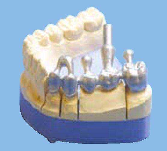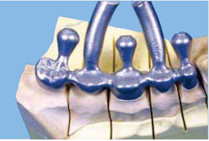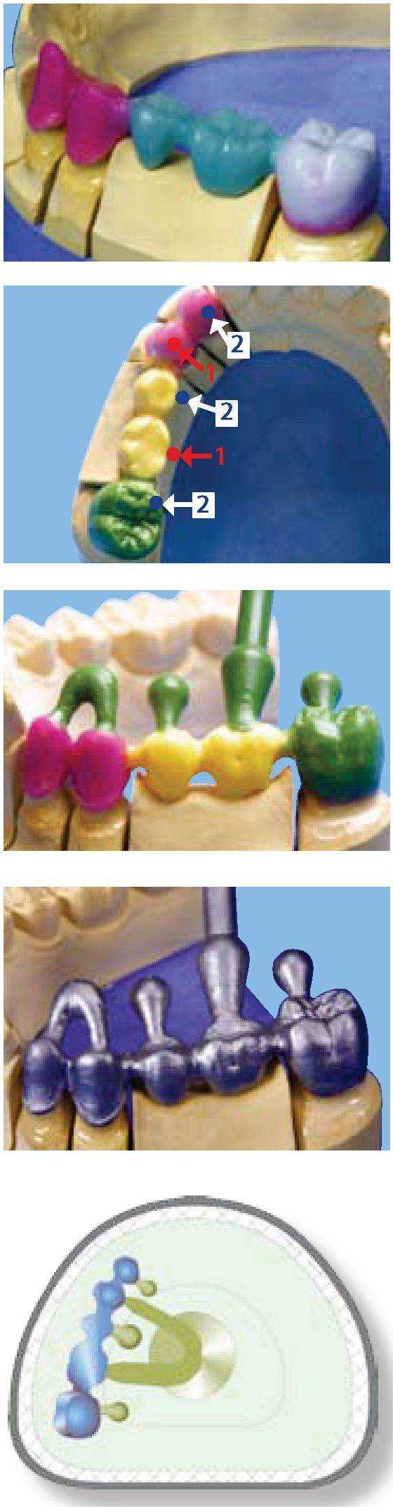 Этот мостовидный протез фронтального отдела зубного ряда из восьми протезных единиц снабжен очень хорошим коллектором распределения расплава. Размеры литниковых каналов определяются в соответствии с руководством. Здесь акцентируется внимание на удлинении литниковых путей. Для того, чтобы уменьшить гидравлическое сопротивление в литниковом канале, увеличивают диаметр самого литникового канала, не изменяя размеры прибыли. Промежуточные элементы и коронки снабжают двойными прибылями.