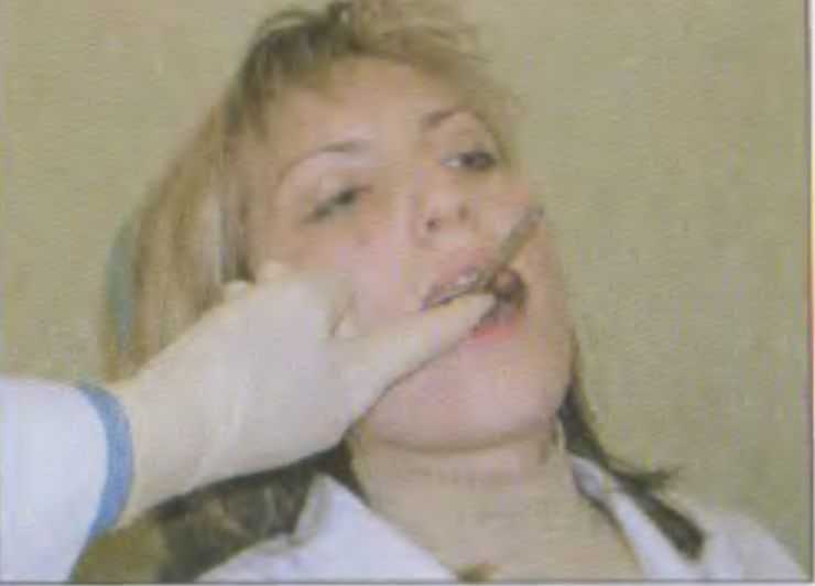 Фиксация лицевой дуги. Для этого необходимо в первую очередь фиксировать собственно лицевую дугу при помощи утттых фиксаторов. Затем на дуге укрепляется носовой упор, который устанавливается на переносицу и жестко фиксирует дугу на голове пациента. После этого на лицевой дуге при помощи винта крепится соединительное устройство для удержания прикусной вилки. Последняя вводится в полость рта отдельно от лицевой дуги ;i прижимается к верхнему зубному ряду. После этого при помощи винтов на соединительном устройстве стержень вилки прикрепляется к лицевой дуге. При правильной фиксации лицевой дуги прикусная вилка плотно прилегает к верхнему зубному ряду (рис. 37). Строгое соблюдение этого правила также направлено на достижение наиболее точных результатов в определении параметров взаимоотношения верхней челюсти с шарнирной осью нижней челюсти. После этого ослабляются винты носового упора и собственно лицевой дуги, которая снимается с головы пациента. Лицевую дугу после снятия с головы пациента всегда нужно класть на стол окклюзионной вилкой кверху во избежание случайного смещения ее из зафиксированного положения.