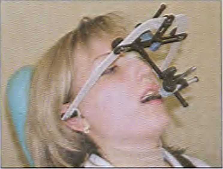 Рис. 37. Лицевая дуга с прикусной вилкой, установленная на голове больного