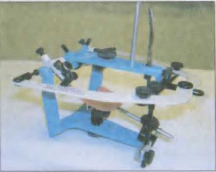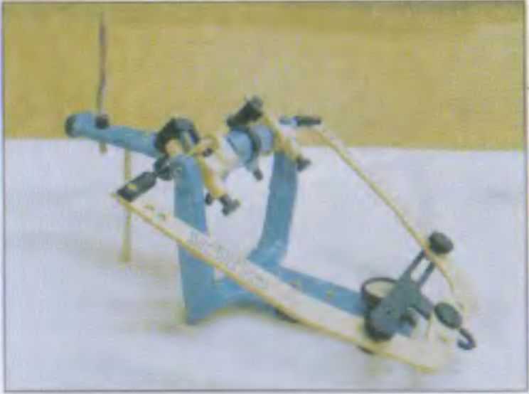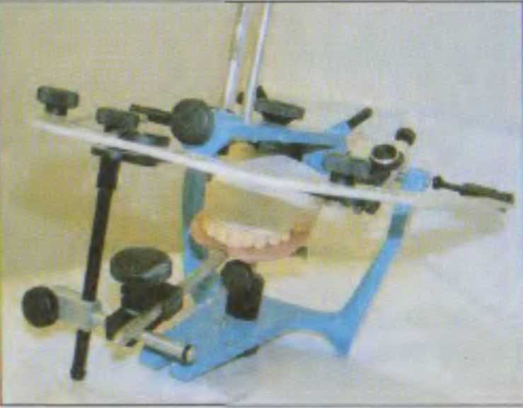 Фиксация моделей в артикуляторе. Лицевая дуга присоединяется к артн куля тору за счет штифтов, расположенных