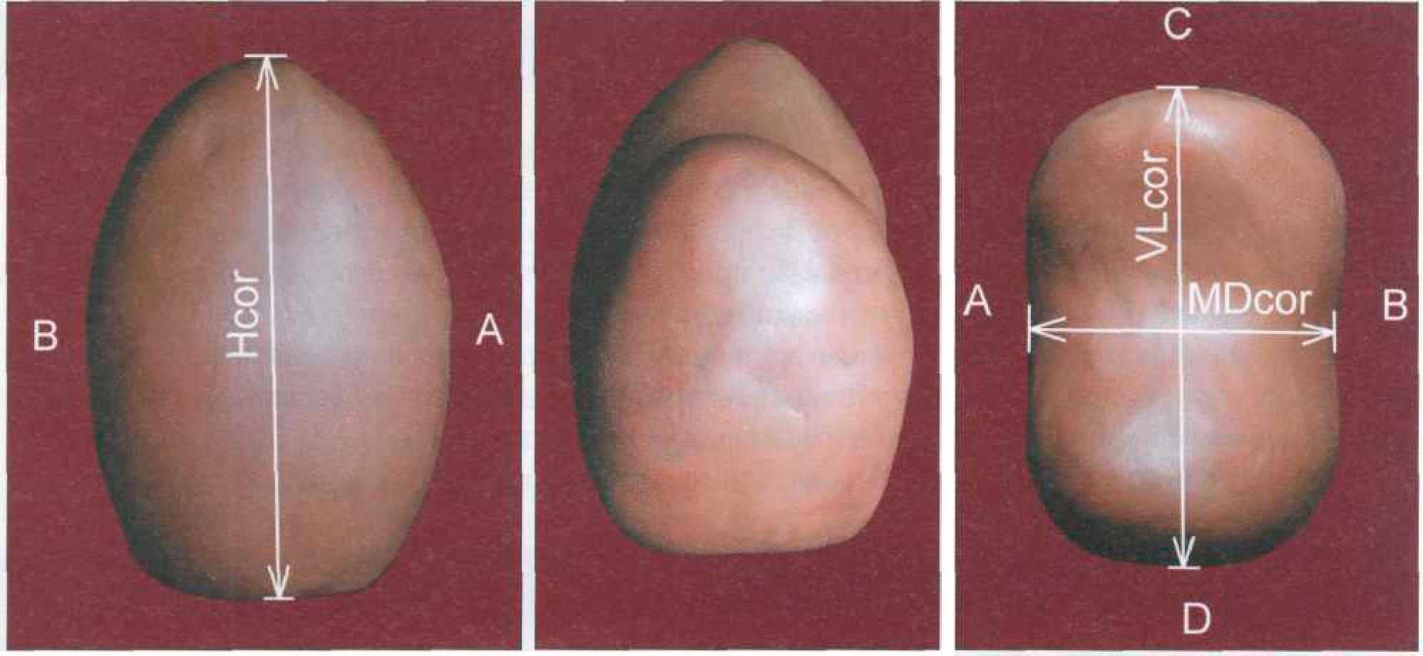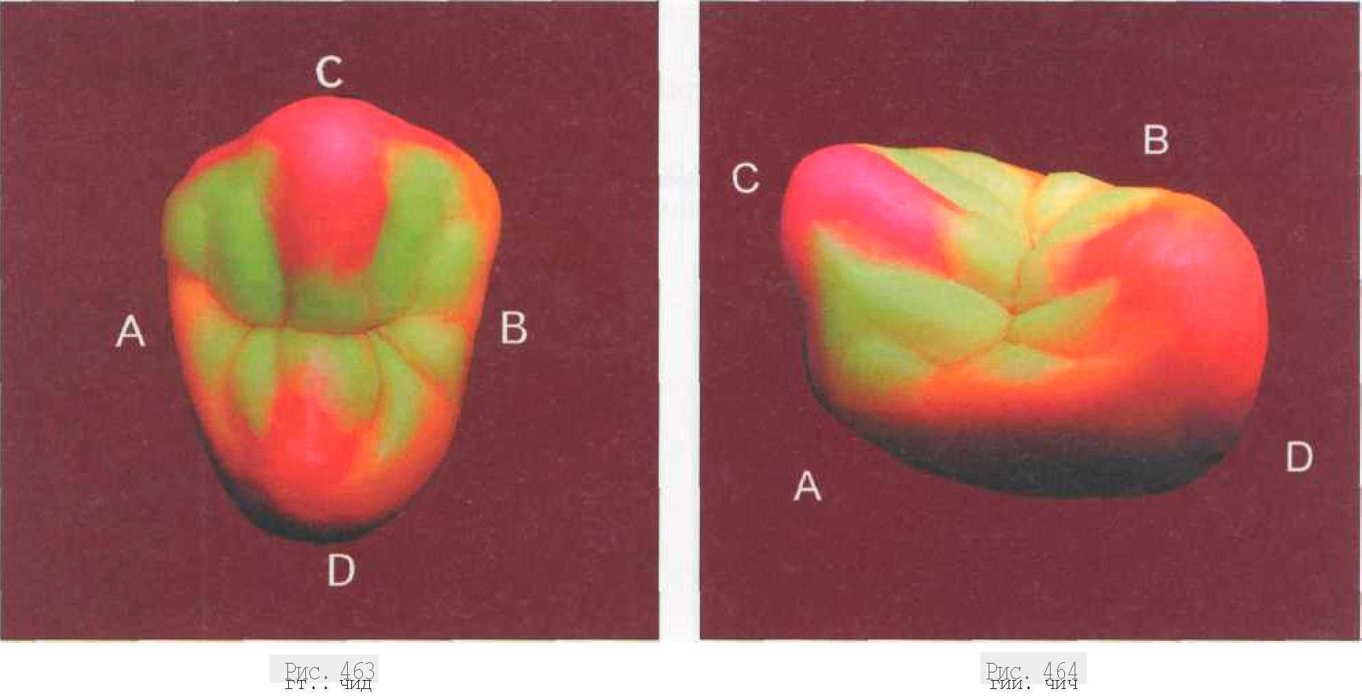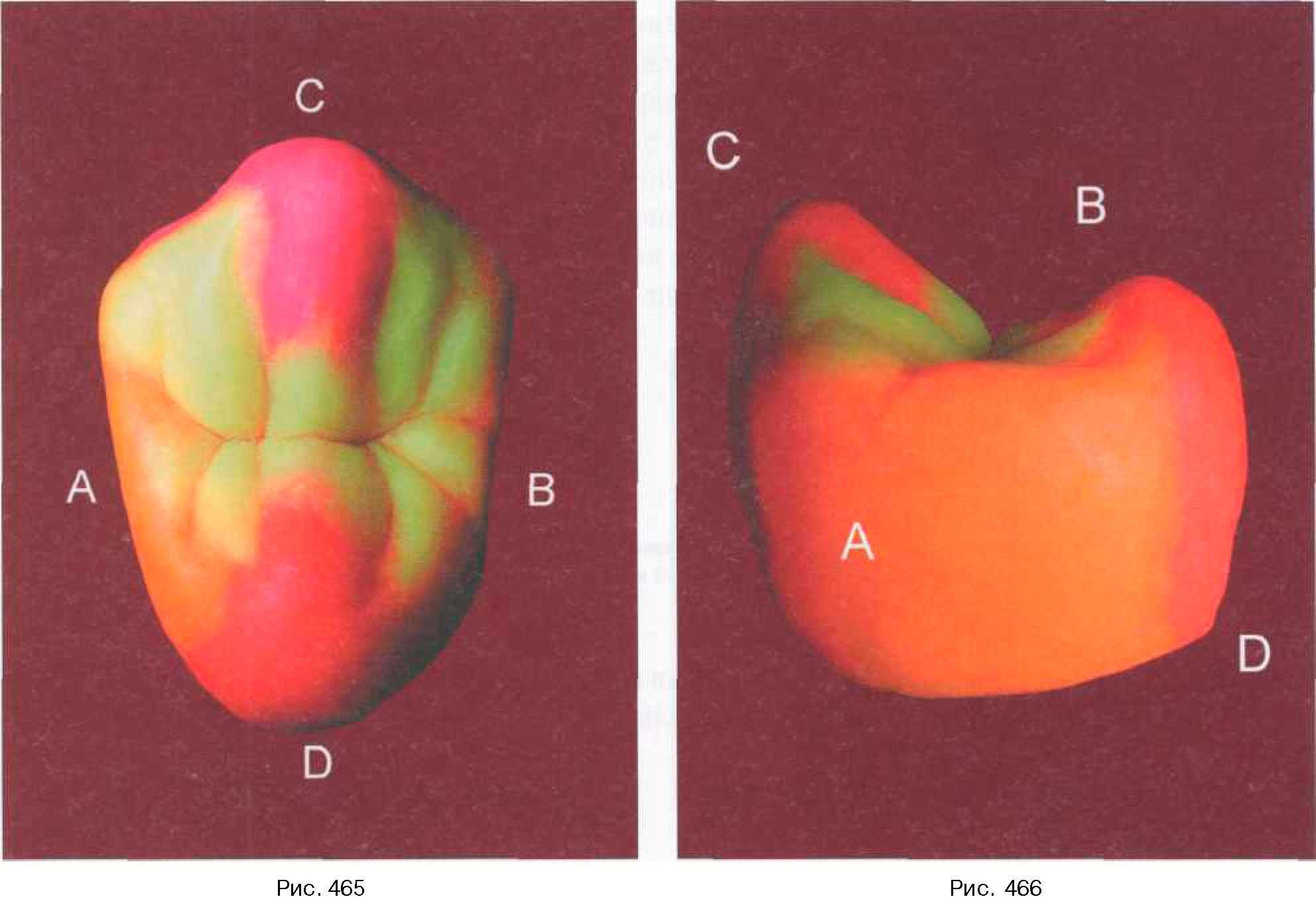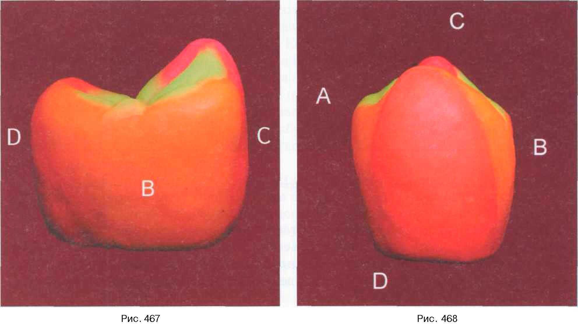 Путем наложения дополнительного подручного материала (зеленый цвет) на область жевательной поверхности, усиливается рельефность основных морфологических элементов, более четче оформляется межбугорковая фиссура и ее ответвления, увеличивается количество борозд второго и третьего порядка, детализируется микрорельеф жевательной поверхности. В заключении демонстрируется отмоделированная коронка верхнеголевого первого премоляра с различных позиций:жевательной (рис. 465), передней контактной (рис. 466), задней контактной (рис. 467), небной (рис. 468).