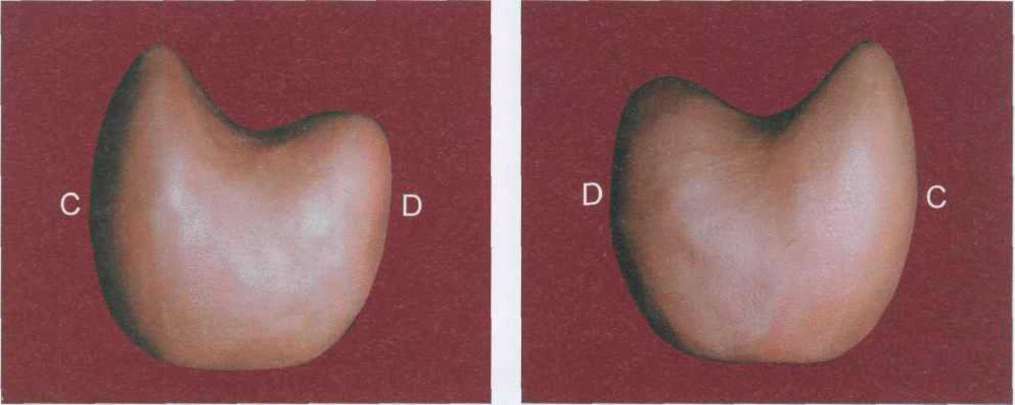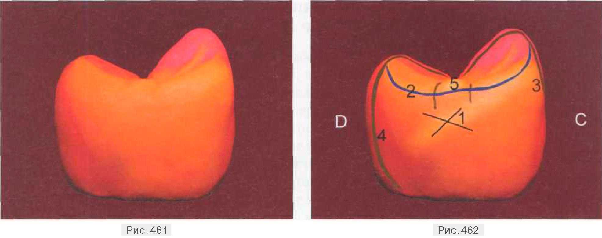 Со стороны небной поверхности прослеживается хорошо выраженная, смещенная медиально вершина рвущего бугра продольного валика небного одонтомера. Асимметрия положения рвущего бугра позволяет увидеть морфологию жевательной поверхности коронки премоляра. Боковые стороны имеют округлые формы, сходящиеся в пришеечной области. При формировании медиальной контактной поверхности от медиального угла вестибулярного одонтомера в направлении к пришеечной области небного одонтомера выкладываем на всем протяжении контактной поверхности валик, наибольшая выпуклость которого оформляется на границе окклюзионной и средней трети коронки (рис. 459, 460).