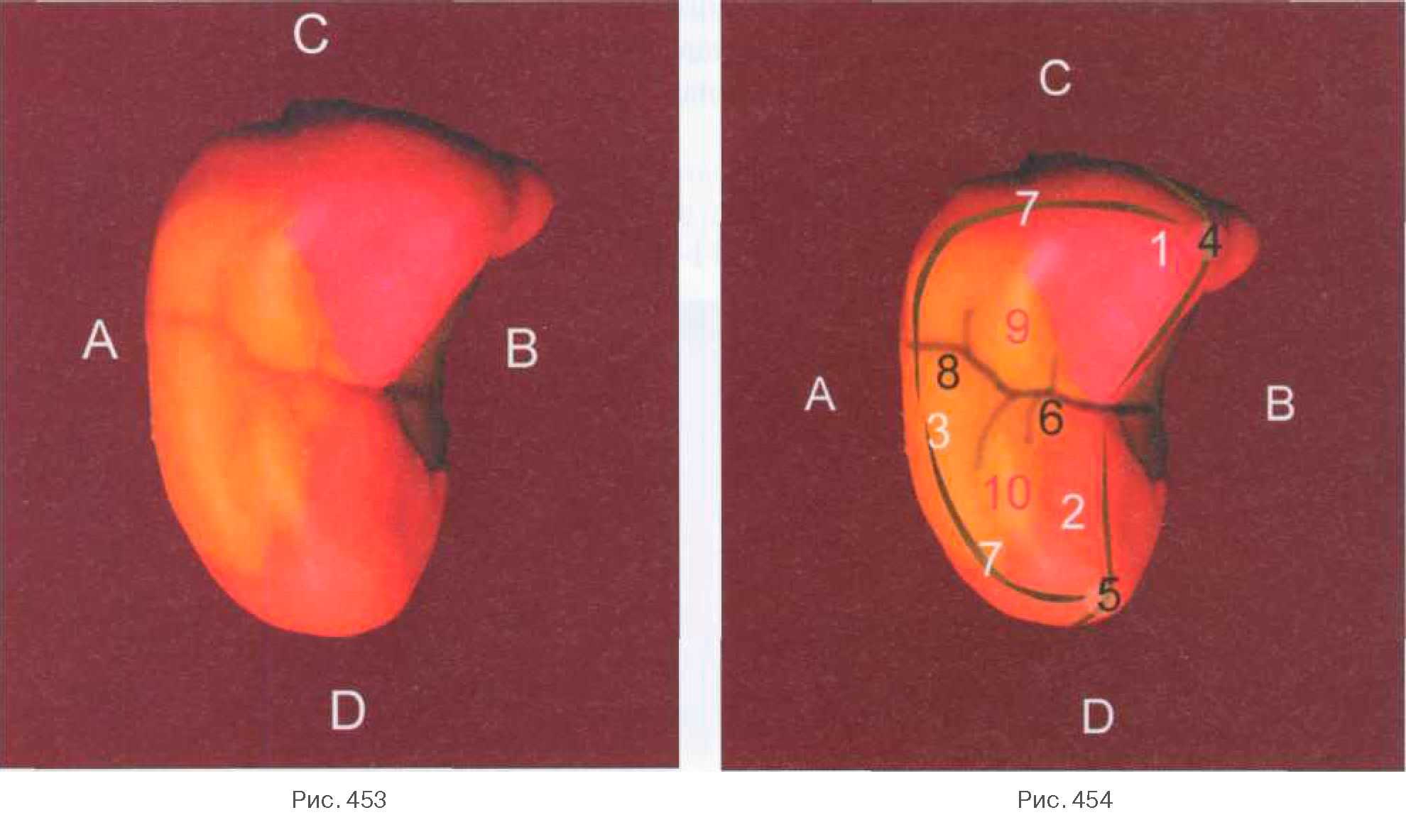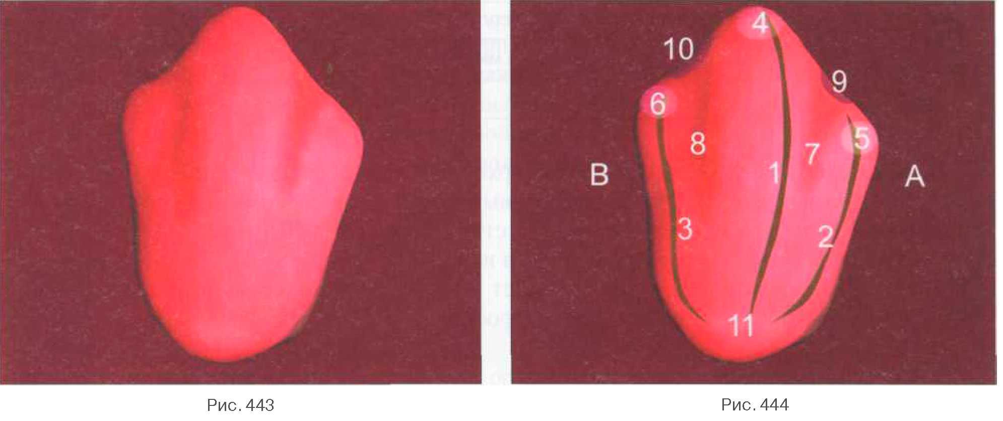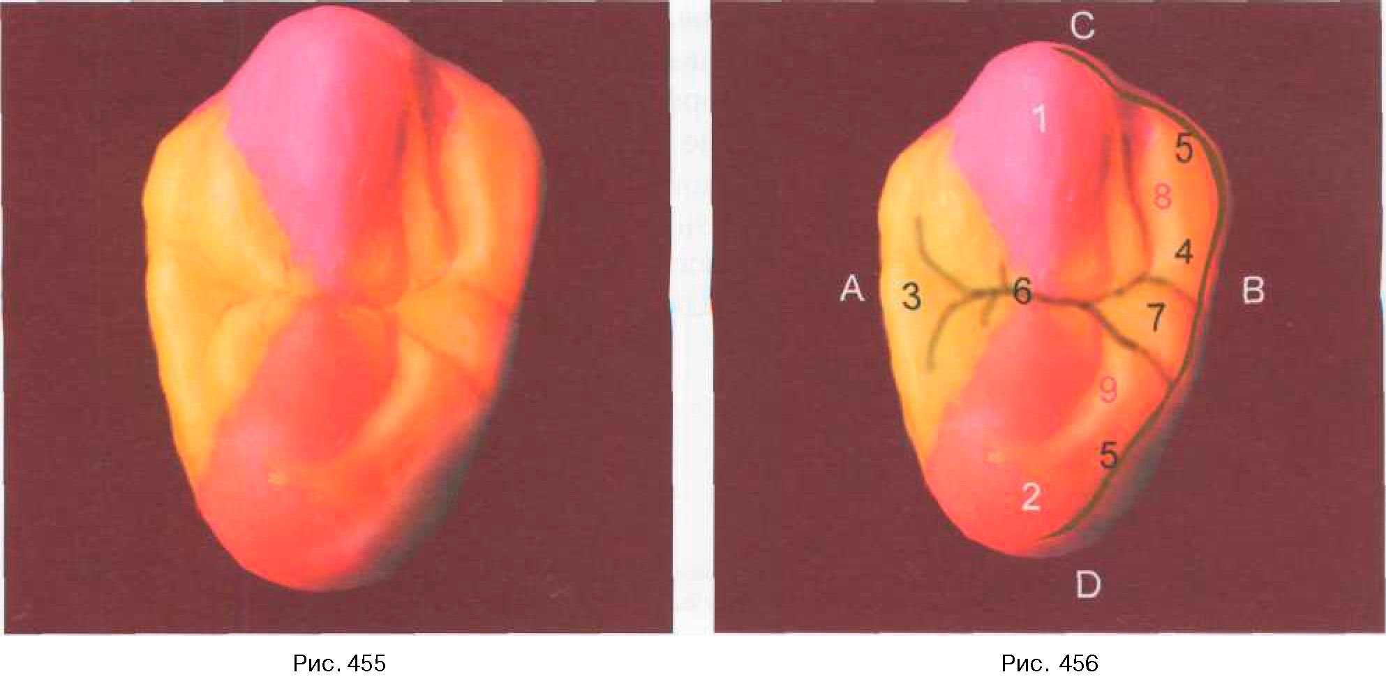 единяющий между собой вершины рвущих бугров обоих одонтомеров (5). Дистальная часть межбугорковой фиссуры (6) пересекает краевой гребень двумя веточками, образуя при этом дополнительный дистальный бугорок (7). Между продольными валиками обоих одонтомеров и дистальными частями краевого гребня (5) по разным сторонам от центральной фиссуры сформированы дистальный валик вестибулярного одонтомера (8) и дистальный валик небного одонтомера (9). Небная поверхность верхнего левого первого премоляра формируется достаточно сглаженной, лишенной гребней и фиссур (рис. 457, 458).