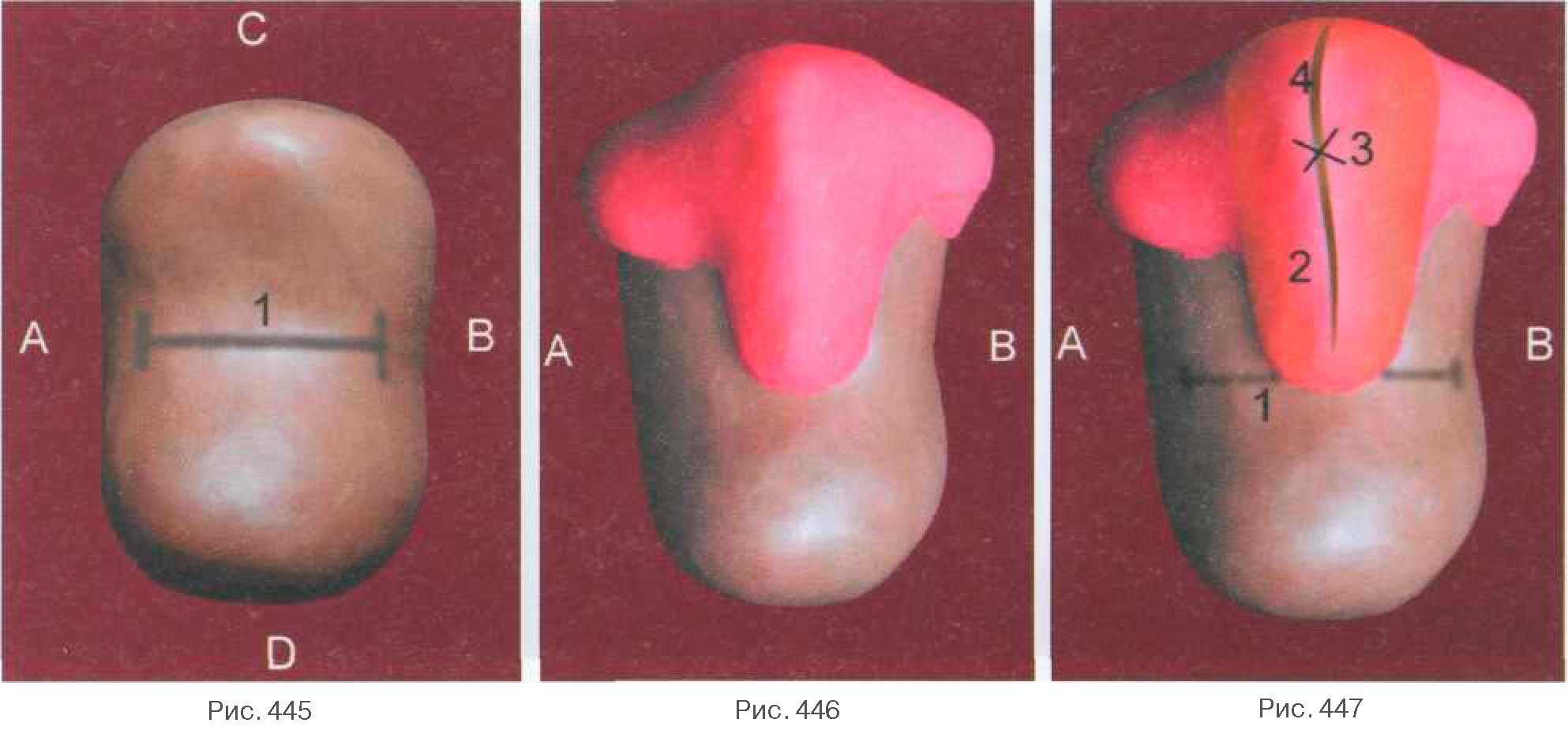 Валик оформляем треугольной формы, его гребень (4) медиально изгибаем. Оформляя небный одонтомер со стороны жевательной поверхности, следует учесть, что он несколько ниже по высоте, меньше по занимаемой площади. Его продольный валик (3) моделируем в направлении центральной фиссуры, рвущий бугор (4) небного одонтомера располагаем медиально (рис. 450-452).