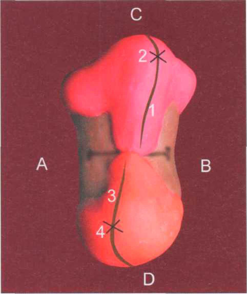 Примерно на середине данной поверхности просматривается медиально изогнутый, продольный валик (1), берущий начало в пришеечной трети, расширяясь в средней трети и заканчивающийся в области режущего края невысоким, недостаточно выраженным рвущим бугорком (4). По краям щечной поверхности сформированы медиальный (2) и дистальный (3) валики, S-образно изогнутые в средней трети и заканчивающиеся соответствующими медиальным (5) и дистальным (6) округлыми бугорками на режущем крае. Образовавшиеся между валиками медиальное (7) и дистальное (8) углубления имеют треугольную форму, вершины которых обращены к средней трети коронки, а основания образуют на режущем крае небольшие вырезки (медиальную — (9), дистальную — (10)). В пришеечной трети, соединяя три валика щечной поверхности воедино, оформлен выпуклый экватор (11). Приступаем к оформлению жевательной поверхности. Нанесением межбугорковой или центральной фиссуры (1) делим поверхность на две примерно равные части для расположения будущих бугорков-одонтомеров (Рис. 445-449).