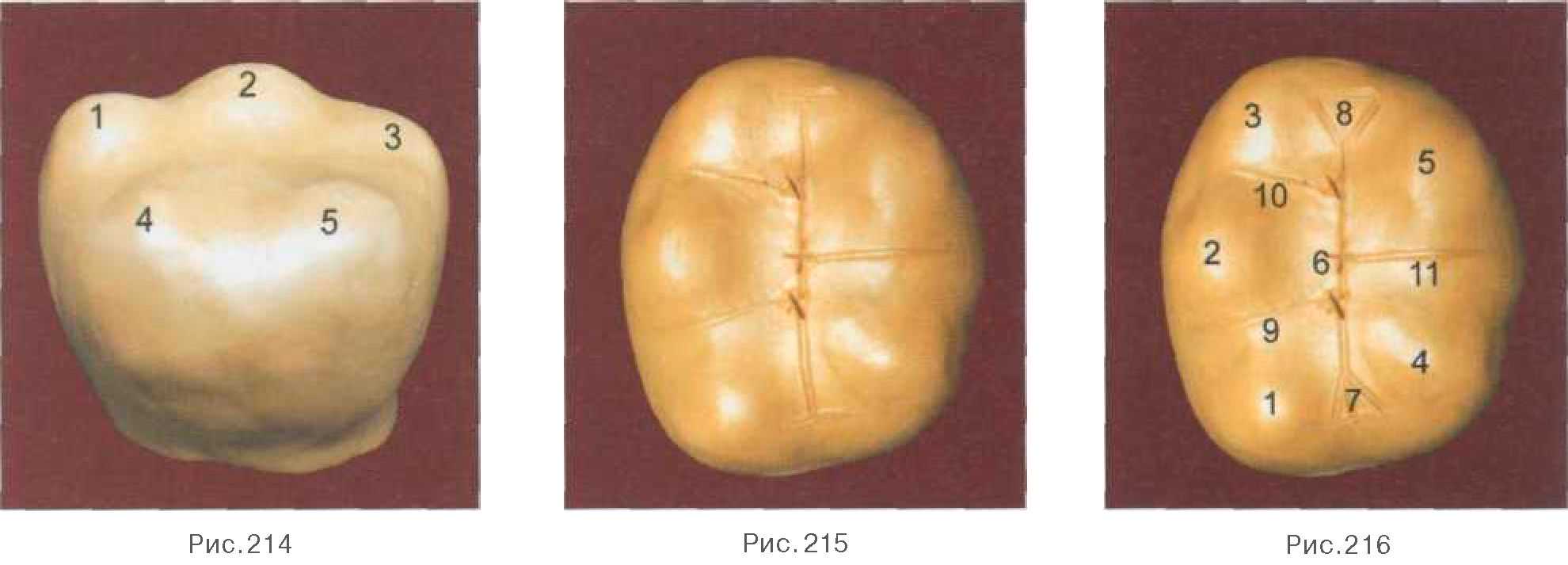 Таким образом, длина коронки превалирует над ее шириной. Имеющийся расчет соотношений частей в определенных пропорциях помогает исполнителю сделать заготовку первого моляра нижней челюсти достаточных размеров для последующей работы с ней. Далее размечаем фиссуры. Для этого на жевательную поверхность наносим сетку, благодаря которой выделяются ячейки, в которых в последующем будут располагаться основные бугорки (модули — одонтомеры) (рис. 214-216).