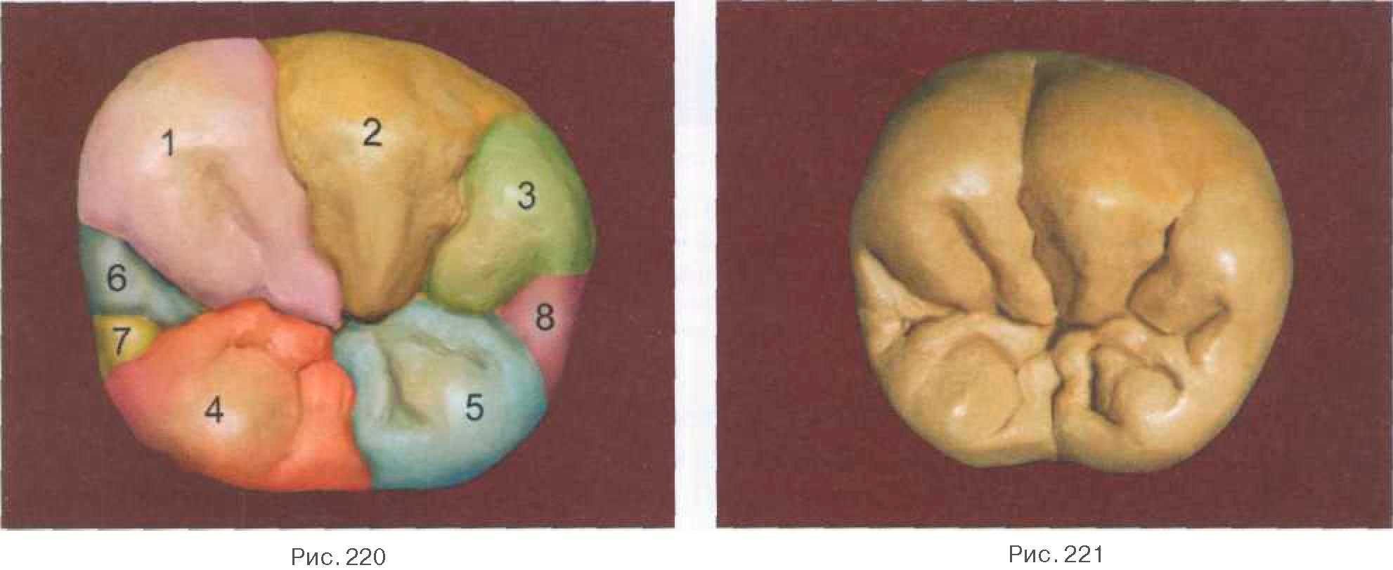 Заканчиваем моделирование жевательной поверхности 46 зуба формированием дистального краевого гребня, ограничивающего триангулярную ямку и представляющего собой самостоятельное образование-одонтомер (8). Приступаем к моделированию щечной поверхности (рис. 222, 223).