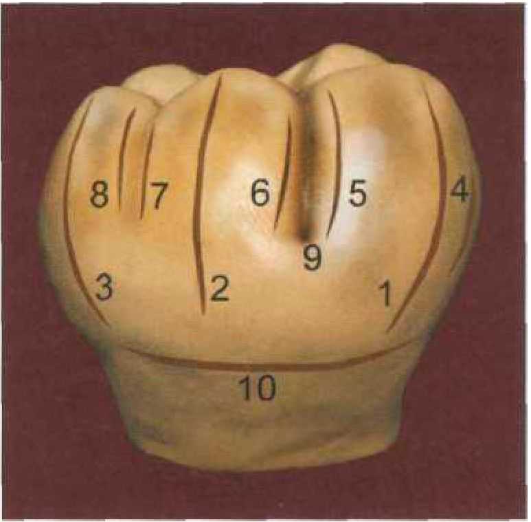 Его моделирование можно начать с медиального валика (4), который является медиальным краем щечной поверхности. Ход гребня данного валика варьирует по поверхности: начинаясь от медиального угла протоконида, он направляется вначале медиально, затем незначительно изгибается дистально в направлении шейки зуба. Основную выпуклость медиального бугорка со щечной поверхности создаем, моделируя продольный валик (1) (в средней трети его длины). Дистальный валик (5) короче двух предыдущих — заканчивается на уровне вестибулярного отверстия (9). Дистальный скат дистального валика граничит с вестибулярной бороздой (или скатывается в вестибулярную борозду). Валики разделены между собой слабовыраженными углублениями. Дистовестибулярный бугорок (гипоконид) моделируется несколько меньшим по размеру, в отличие от медиального бугорка. Ему также присущи основные морфологические элементы: продольный (2), дистальный (7), медиальный (6) валики и разделяющие их дистальное и медиальное углубления. Самым маленьким по размеру оформляем дистальный бугорок. Гребень его продольного валика (3) представляет собой дистальную границу щечной поверхности. Медиальный валик (8) моделируем на щечной поверхности, дистальный — на дистальной контактной поверхности. В пришеечной трети оформляем выпуклый экватор (10). Моделируем язычную поверхность (рис. 224, 225). Лингвальной бороздой (1) делим данную поверхность на две, примерно равные выпуклые части, для оформления контуров медиального более высокого (2) (метаконида) и дистального (энтоконида) (3) язычных бугорков. Продольный валик метаконида моделируется более широким и выпуклым в средней трети поверхности, медиальный и дистальный валики выражены незначительно, медиальный валик при этом является медиальным контактным краем язычной поверхности. Ход гребня медиального валика варьирует по поверхности: начинаясь от медиального угла метаконида, он направляет-
