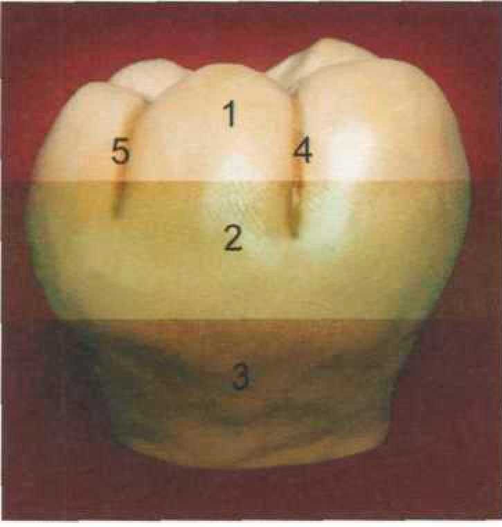 Данная поверхность по горизонтали делится на три части: верхнюю (жевательную — 1), среднюю (2) и пришеечную (3). Вестибулярной (4) и дистовестибулярной (5) бороздами делим данную поверхность на три неравные части для оформления щечных бугров (рис. 222). Самым большим (широким, высоким и более выпуклым) будет медиальный бугорок (протоконид) (рис. 223).